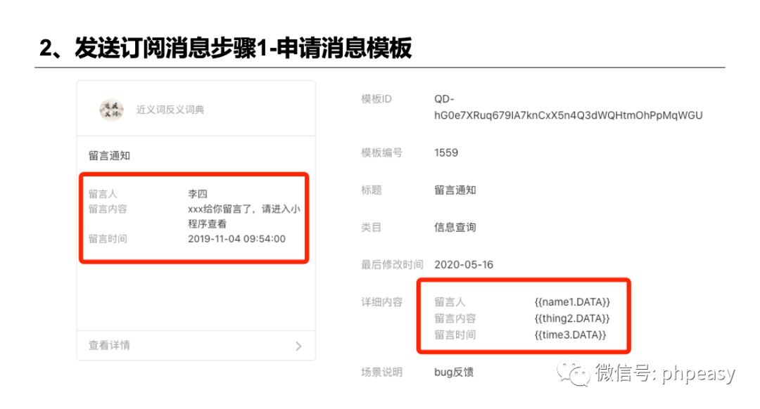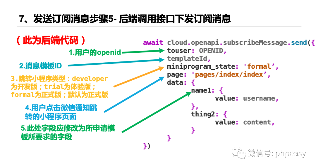 右边是发送订阅消息时调用的微信函数,总共需要传递5个参数: