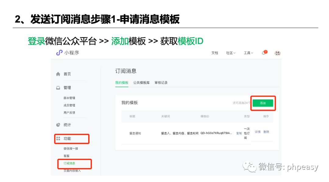 怎么申请呢?我们需要登录微信公众平台,左边菜单栏,点击“订阅消息”菜单按钮,然后右边的“添加”按钮