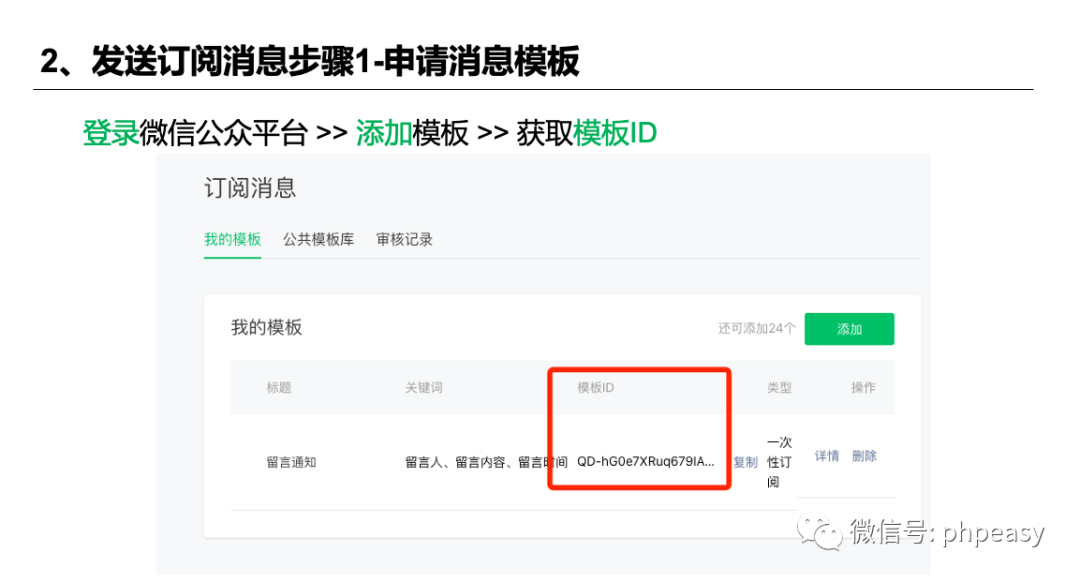 最终我们添加成功之后,会得到该模板的ID,这个ID后面的代码有需要用到。