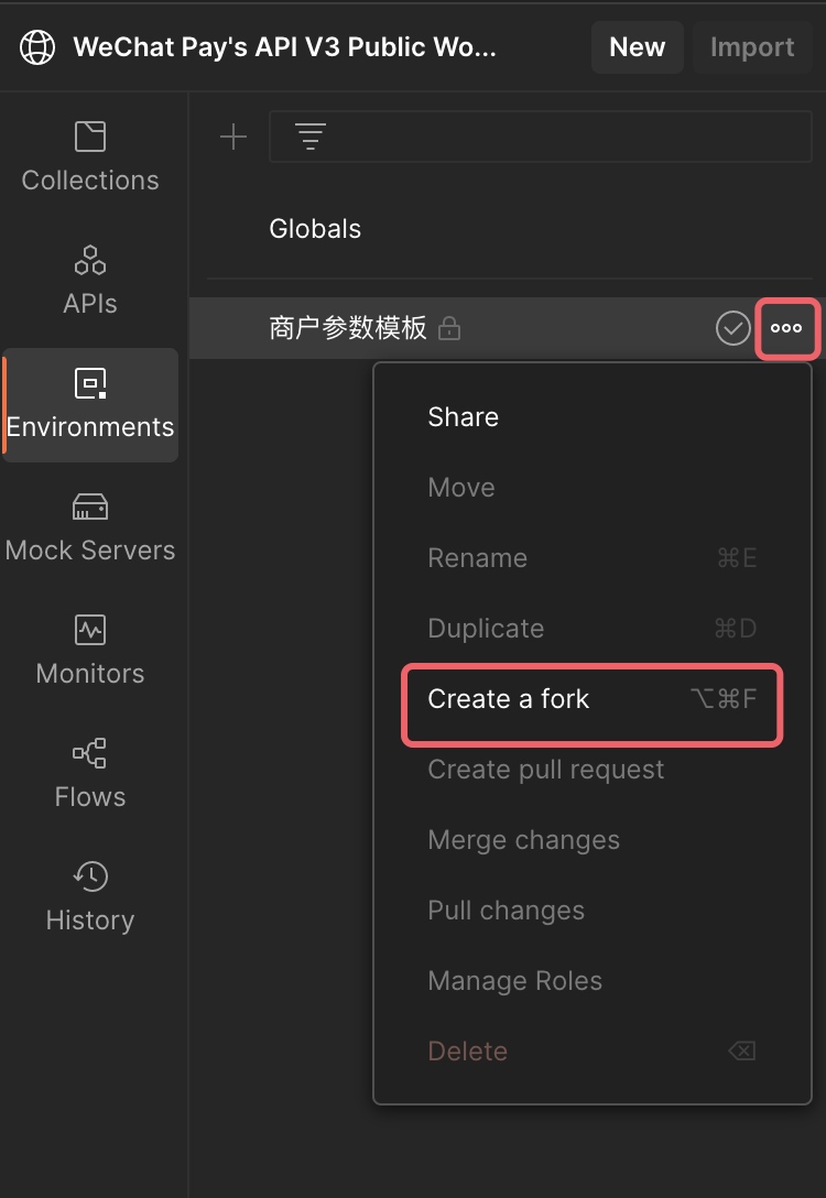 你可以从《微信支付 APIv3》提供的 商户参数模版 中 fork 一个空环境到自己的工作台。