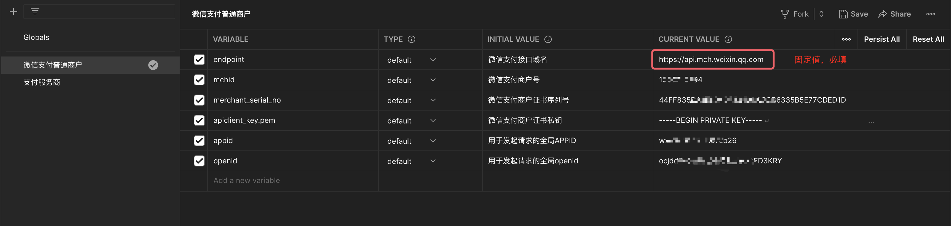 | openid | 选填 | 用于微信支付接口请求中的openid | 如不配置全局变量,请求时需要将参数中的变量openid替换为实际openid值 |