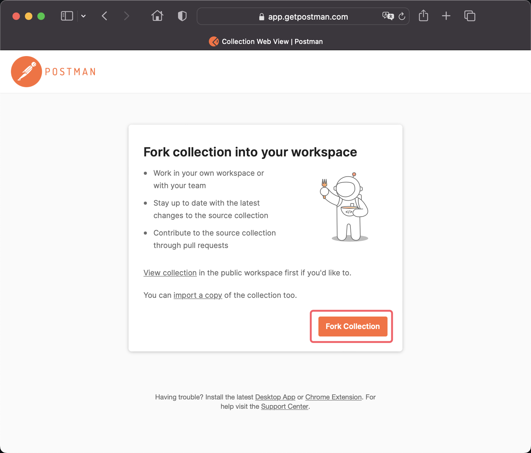 1.2:点击 Fork Collection 进入下一步,填入标签 Fork Label 并选择目的工作台 Workspace。一般情况下,导入个人工作台 My Workspace 即可。