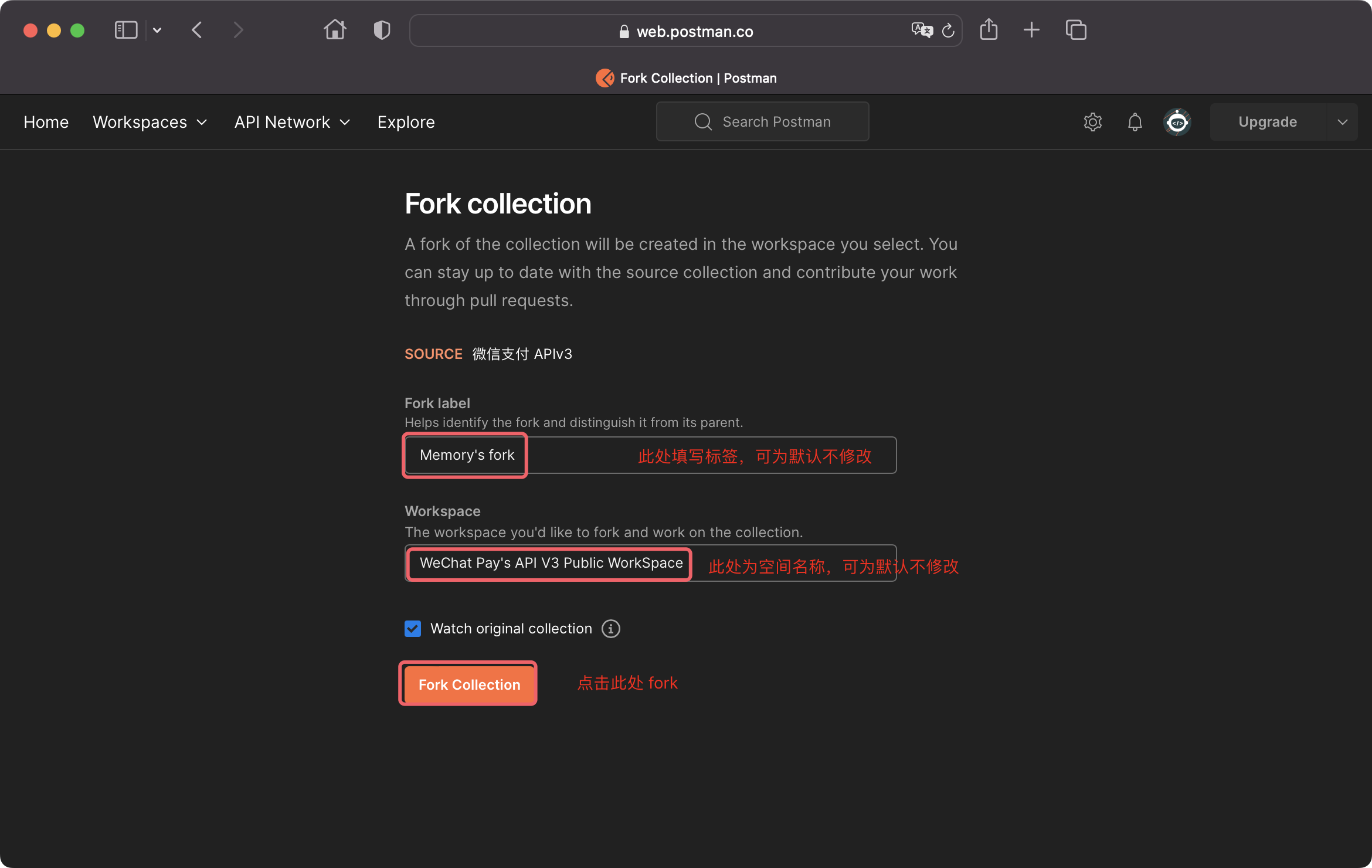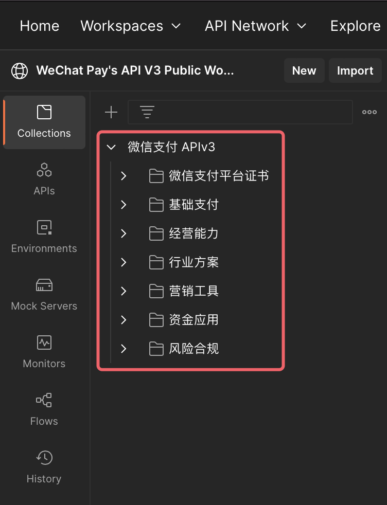 1.3点击 Fork Collection 完成导入。在你指定的 workspace 中可以看到《微信支付 APIv3》了。