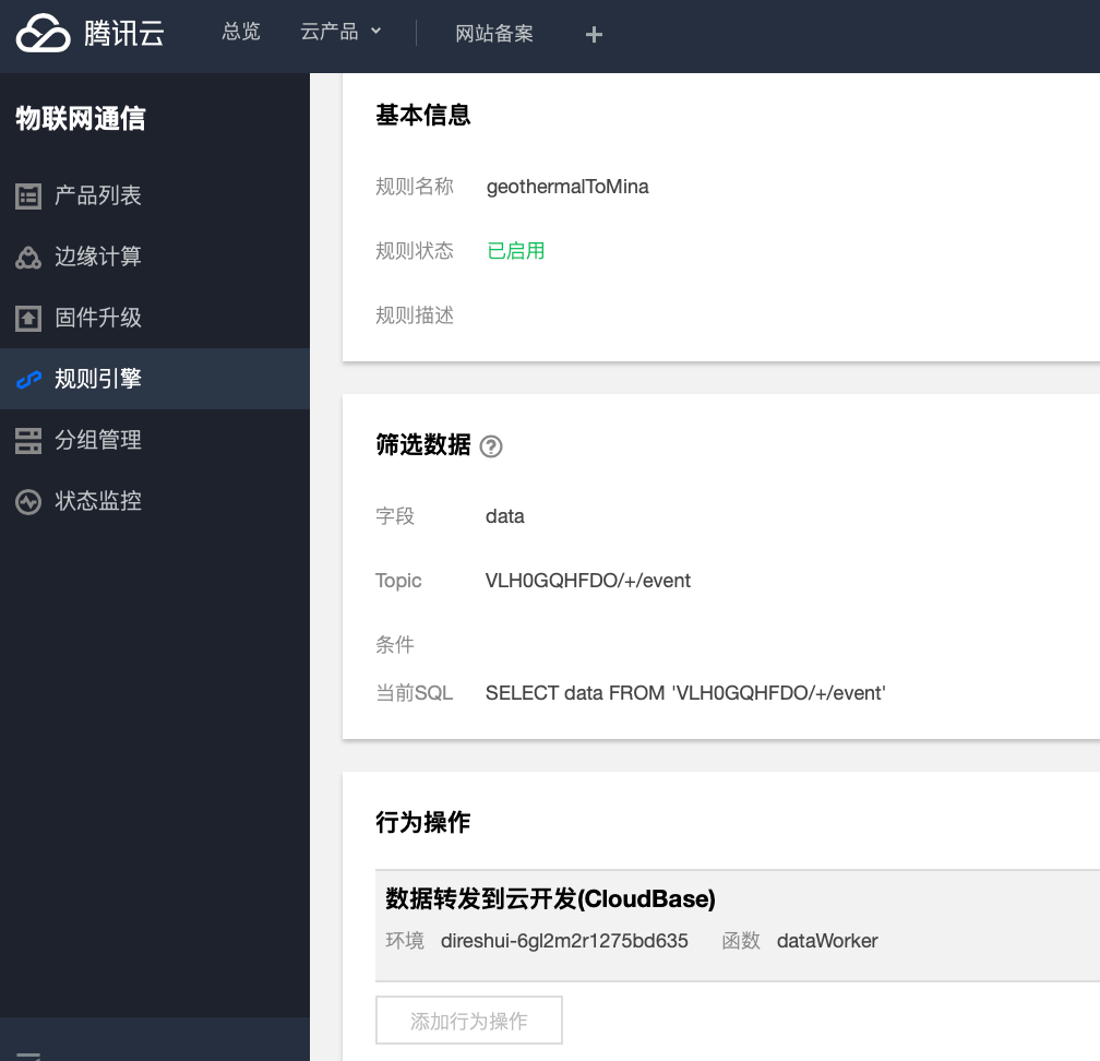 - 在腾讯云物联网通讯中,配置规则,将数据流入到云开发的云函数中;