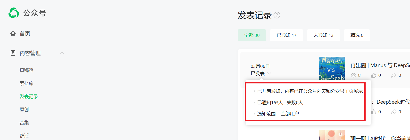 网站api推送文章到公众号成功后,在公众号网页后台可以查看到推送的文章,但是在手机端公众号里没有不知道是什么原因。扫描也可以在手机端查看到。但是进入公众号就查看不到推送过来的文章了。
