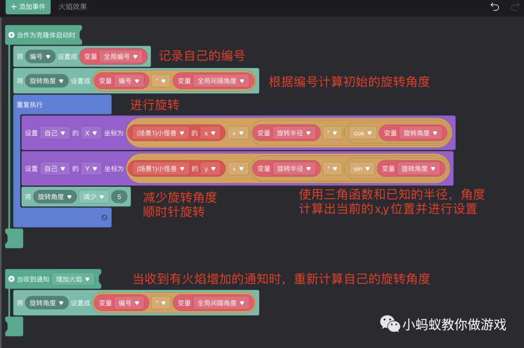 这里比较难理解的地方可能就是“旋转角度”的计算,我们使用“编号”和“全局间隔角度”来计算出当前火焰的初始旋转角度。举个例子就容易理解了,假设有 3 个火焰,360 / 3 可以得到平均的间隔角度为 120 度,现在我们把 3 个火焰编号 1,2,3,那火焰1的初始角度就是 1*120 = 120 度,火焰2的初始角度就是 2*120 = 240 度,火焰3的初始角度就是 3*120 = 360度,只要按照这三个角度来设置三个火焰的初始角度,然后三个火焰都按照相同的方向和速度移动,那它们旋转起来就会达到平衡。