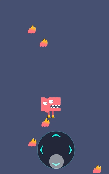 如图,摇杆用于控制角色的移动,小怪兽是游戏的主角,火焰道具是用于拾取的道具,火焰效果是用于围绕小怪兽转圈的道具。