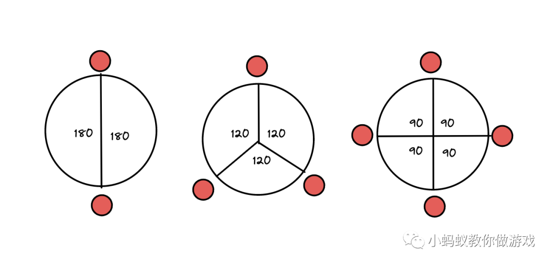 如图,我们都知道一圈是 360 度,当有 2 个球的时候,要平均分布的话,它们要间隔 180 度;当有 3 个球的时候,要平均分布的话,要间隔 120 度;当有四个球的话,要平均分配,要间隔 90度,当有 5 个球的时候..... 其实就是平均分配一个圆形的蛋糕嘛!使用 360 度除以平均分配的数量,就能够知道平均的间隔角度了。