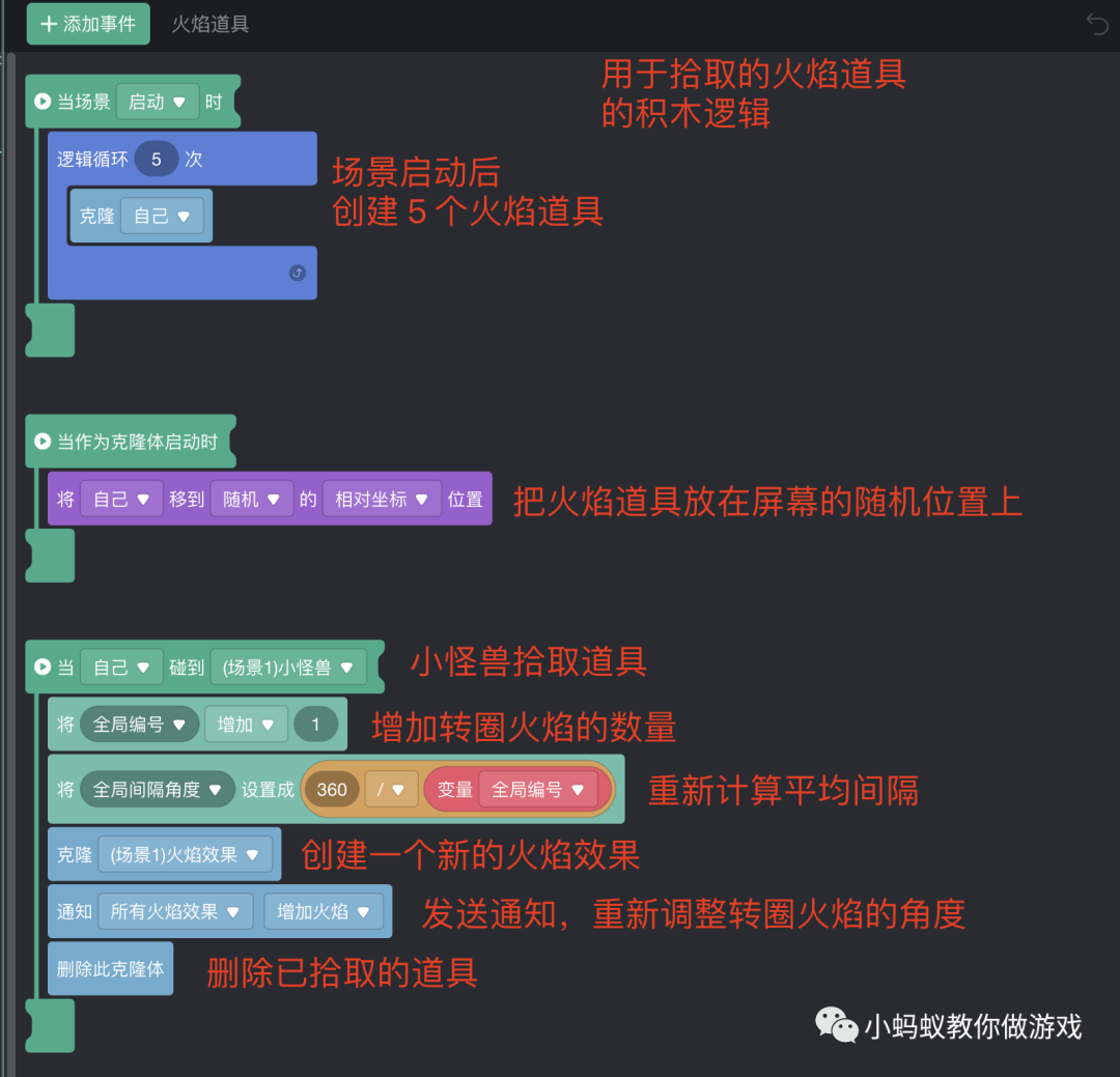 首先,看一下“火焰道具”上的积木逻辑。