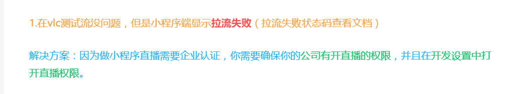 1.在vlc测试流没问题,但是小程序端显示拉流失败(拉流失败状态码查看文档)
