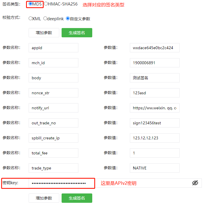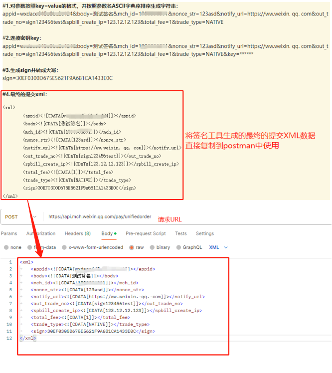 - 结合postman工具和微信官方提供的v2签名工具进行验证,验证时建议只填接口必填参数和直接复制文档上的参数名称,避免手动填写错误,且一定要按照文档要求填入对应的参数值,可参考下面截图中的步骤生成签名和生成最终提交的XML数据