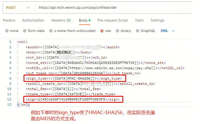 将对应接口的url和签名工具中生成的最终的提交XML数据直接复制到postman工具中发送请求,如返回签名错误,则说明是APIv2密钥错误