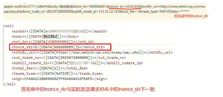 检查签名原串XML中的参数和实际发送请求时XML中的参数是否一致,下面截图中就是一个典型的case