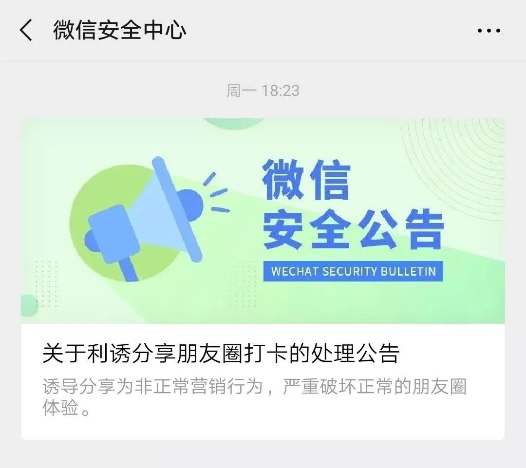 近日,微信又发布了新公告,禁止公众号、APP软件等主体通过以返学费、送实物等方式,利诱微信用户分享其链接(包括二维码图片等)到朋友圈打卡。
