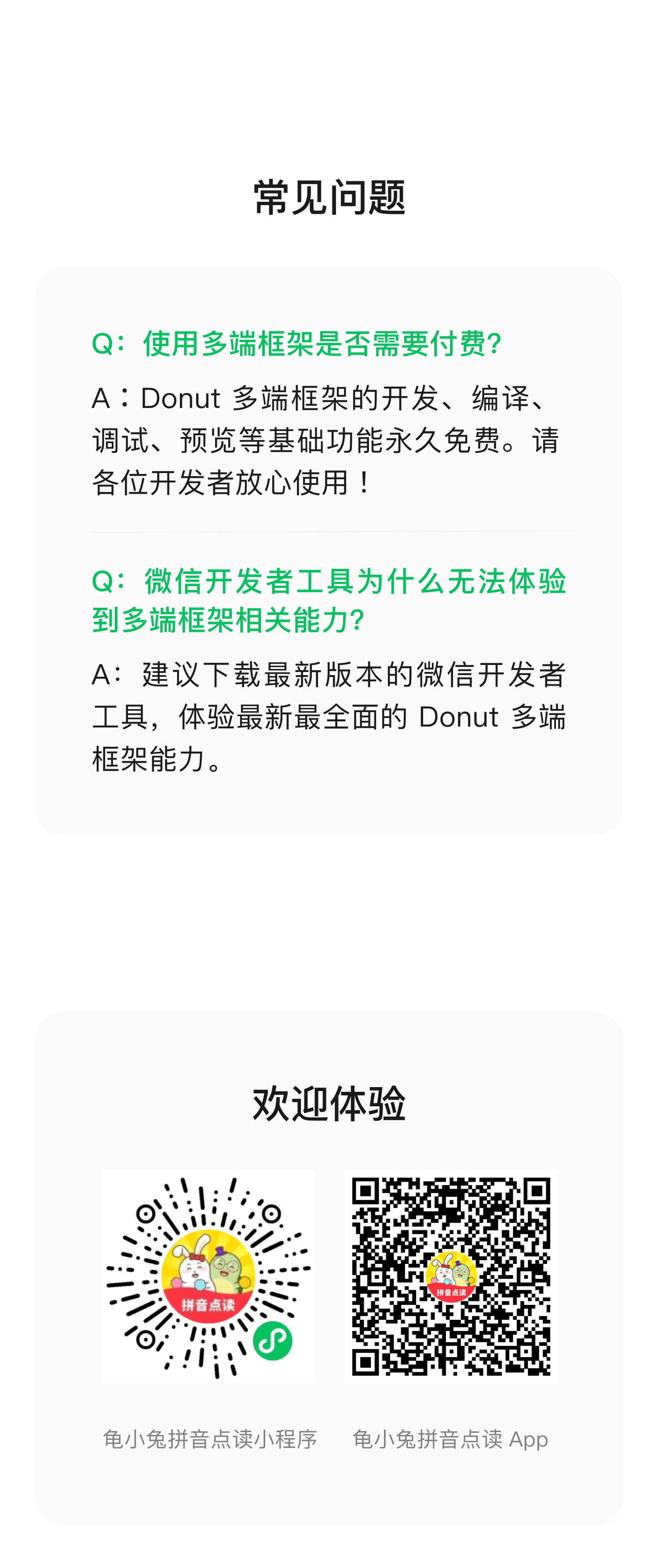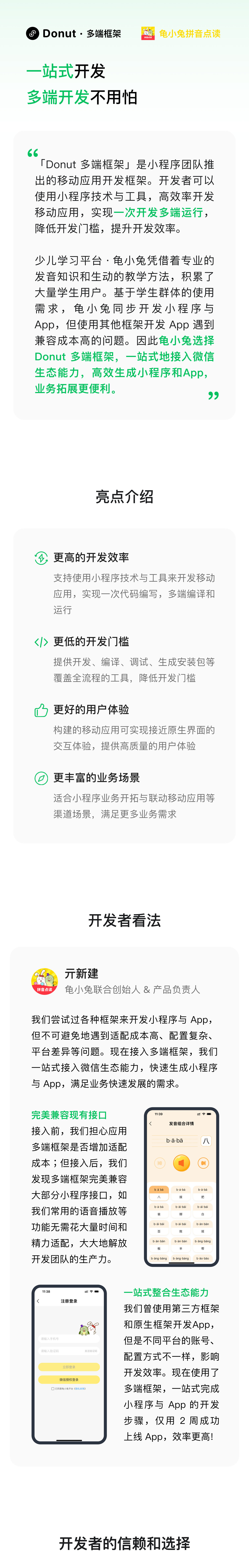 少儿学习平台 · 龟小兔小程序凭借着专业的发音知识和生动的教学方法,积累大量的学生用户。基于学生群体的使用特点,龟小兔借助原生框架和第三方框架开发 App,但多端开发的高昂成本增加创业团队的压力。因此龟小兔选择了多端框架,一站式接入微信生态能力,高效生成小程序和App,业务拓展更便利