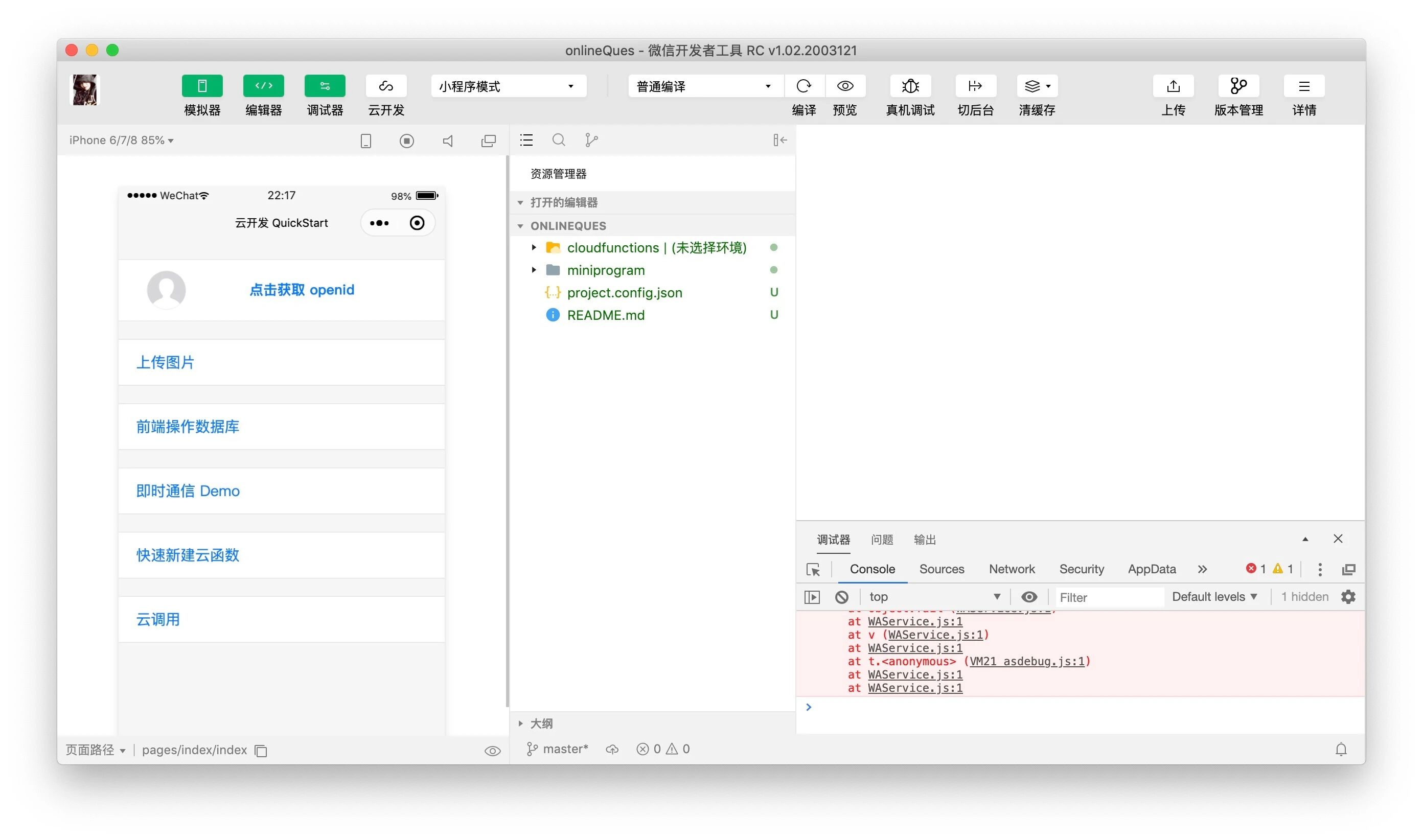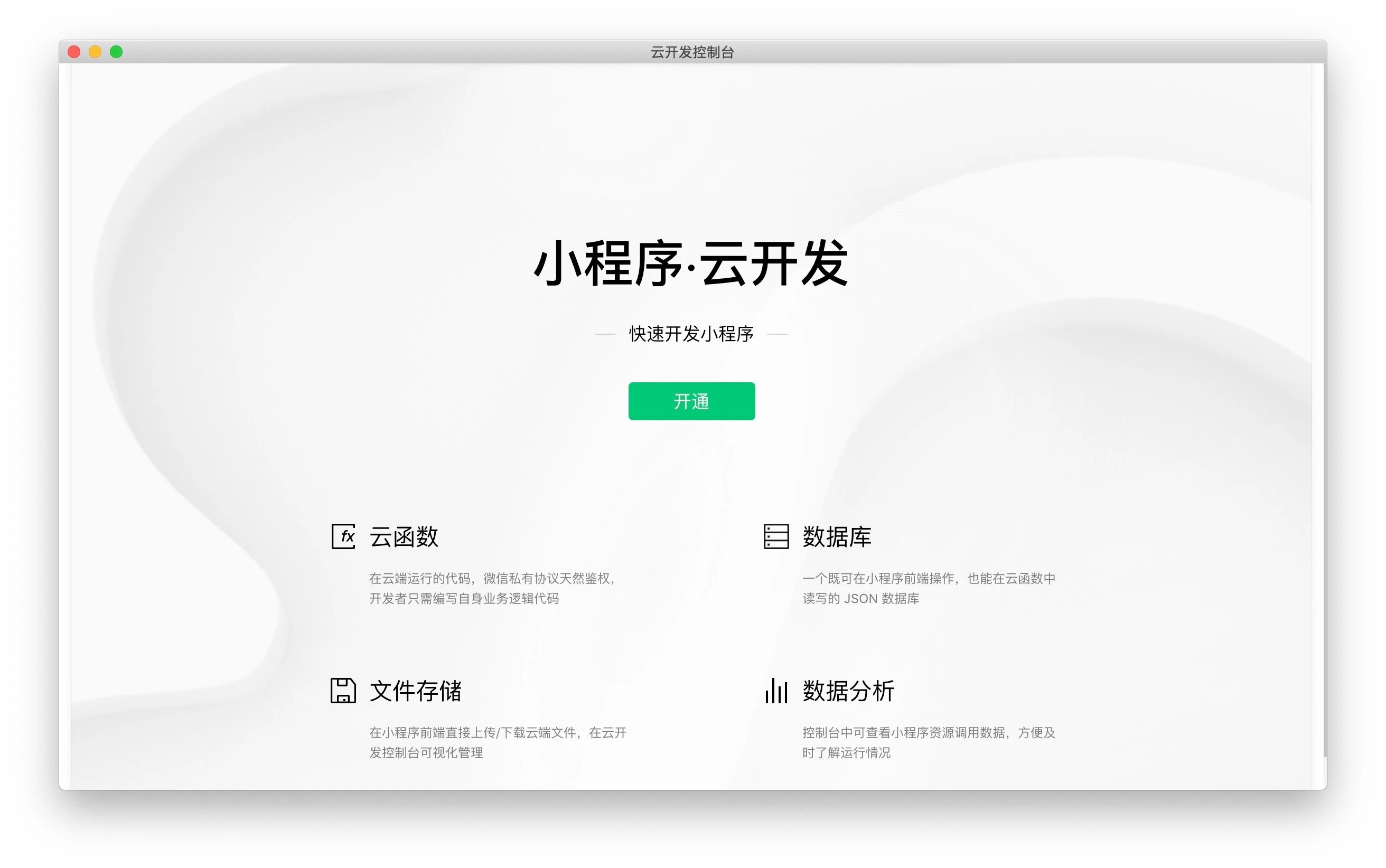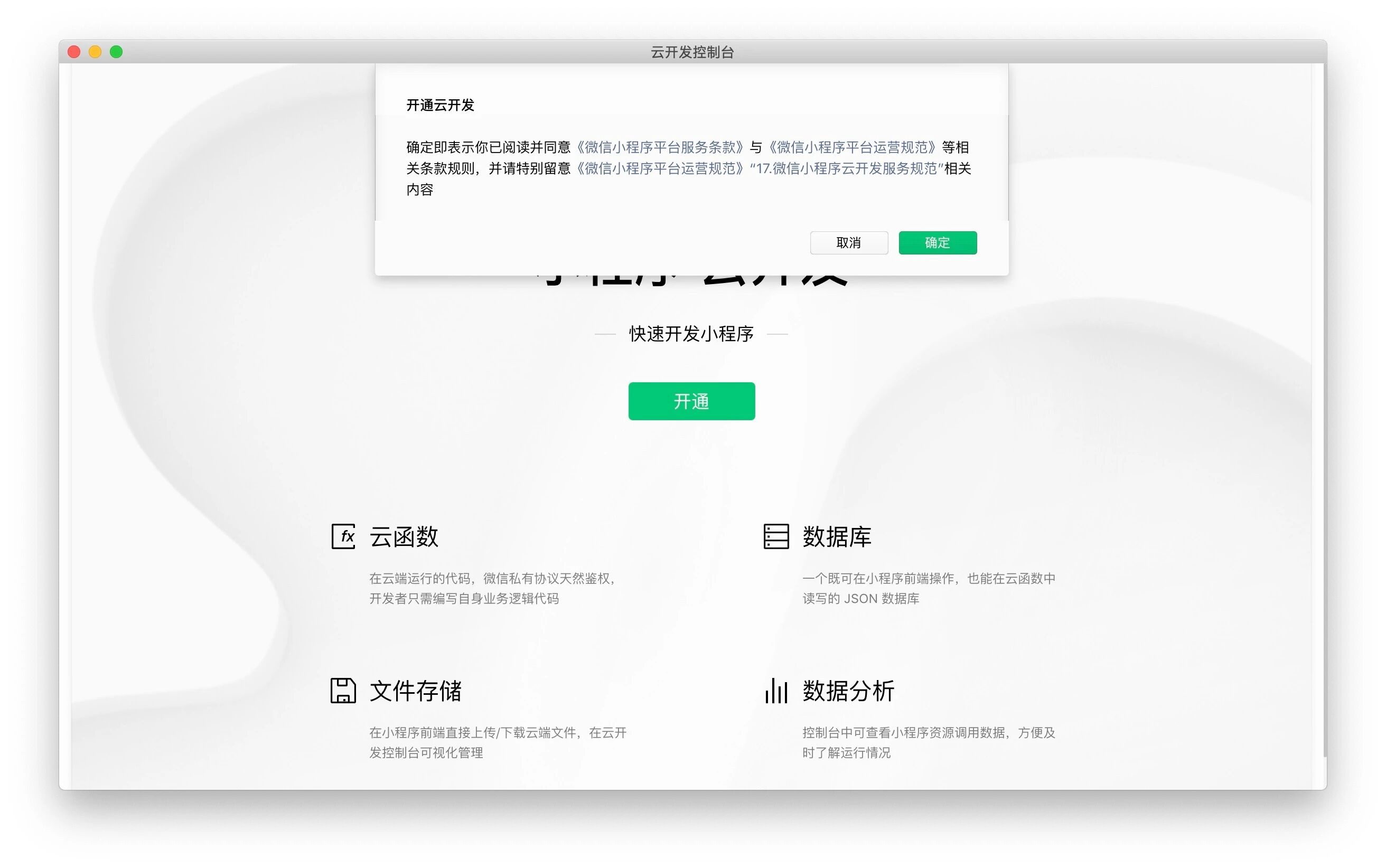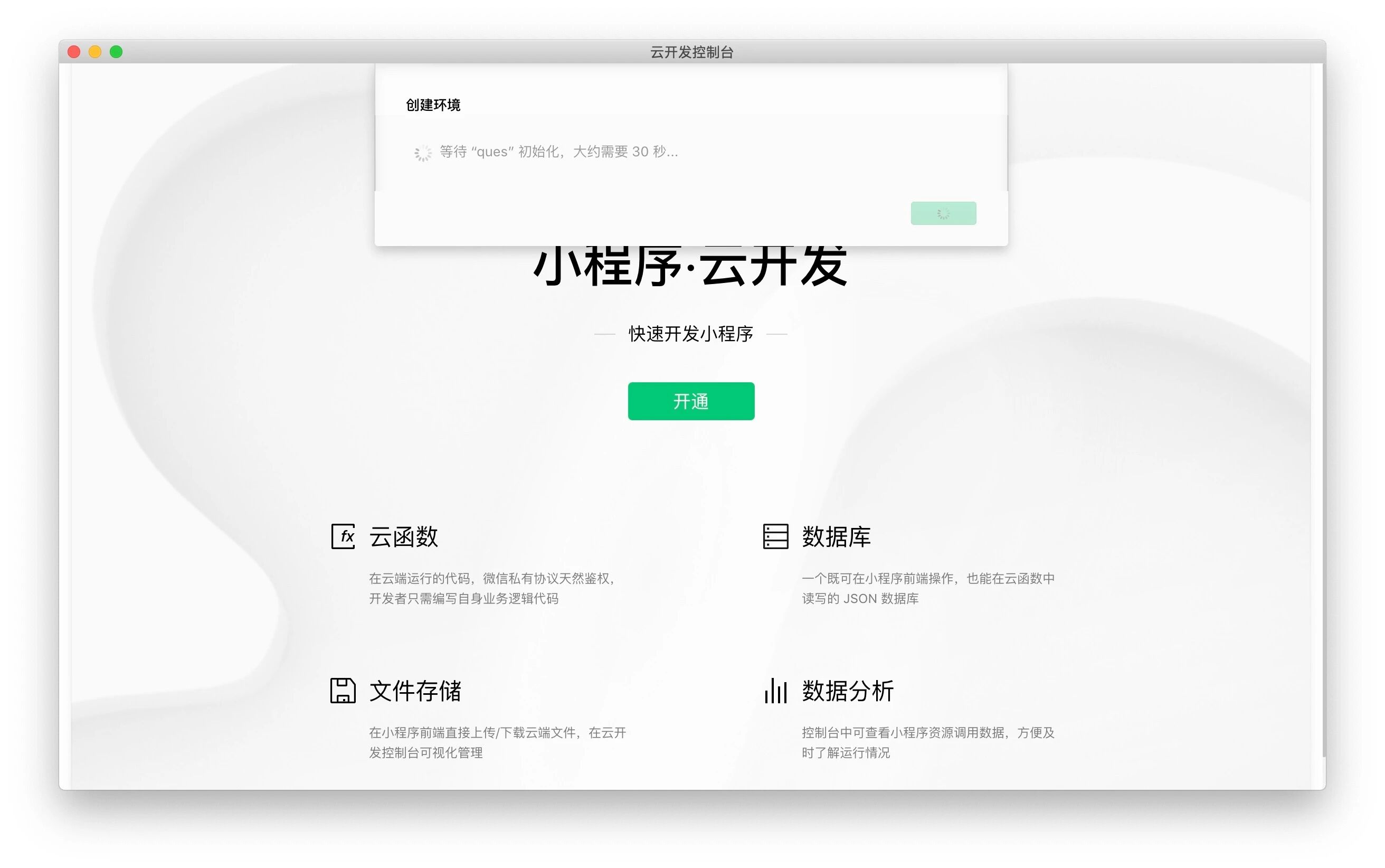 由于云开发初始化大概需要30分钟,所有项目初始化好之后,云开发并不能立即可以用,要等个几分钟。这一点需要留意。