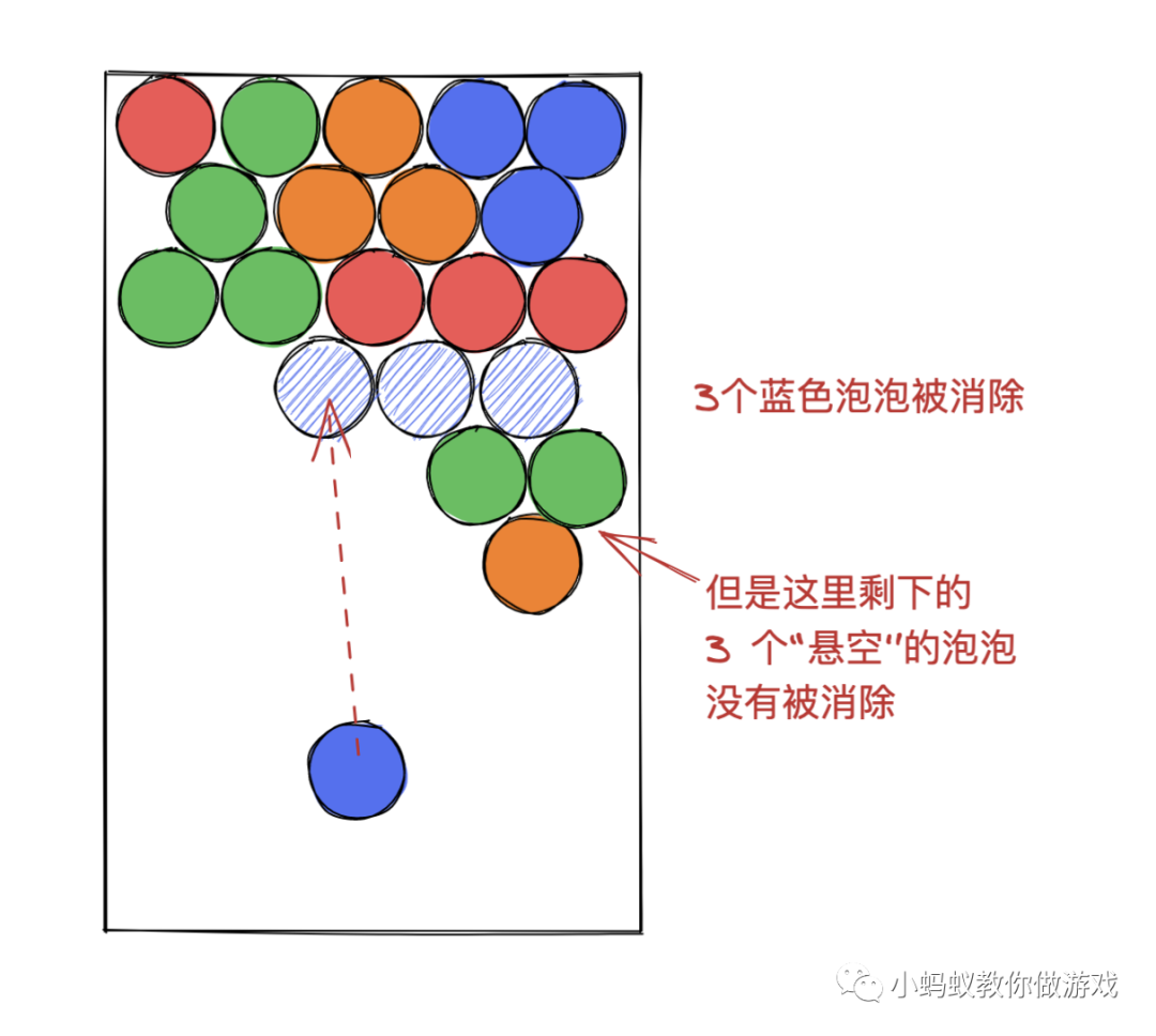 3 个蓝色泡泡被消除了之后,就成了上面图中的样子,剩下了 3 个“悬空”的泡泡。而我们知道这是不对的,在一个正常的泡泡龙游戏中,是不会有“悬空”的泡泡的,下方的这 3 个泡泡也应该被消除。
