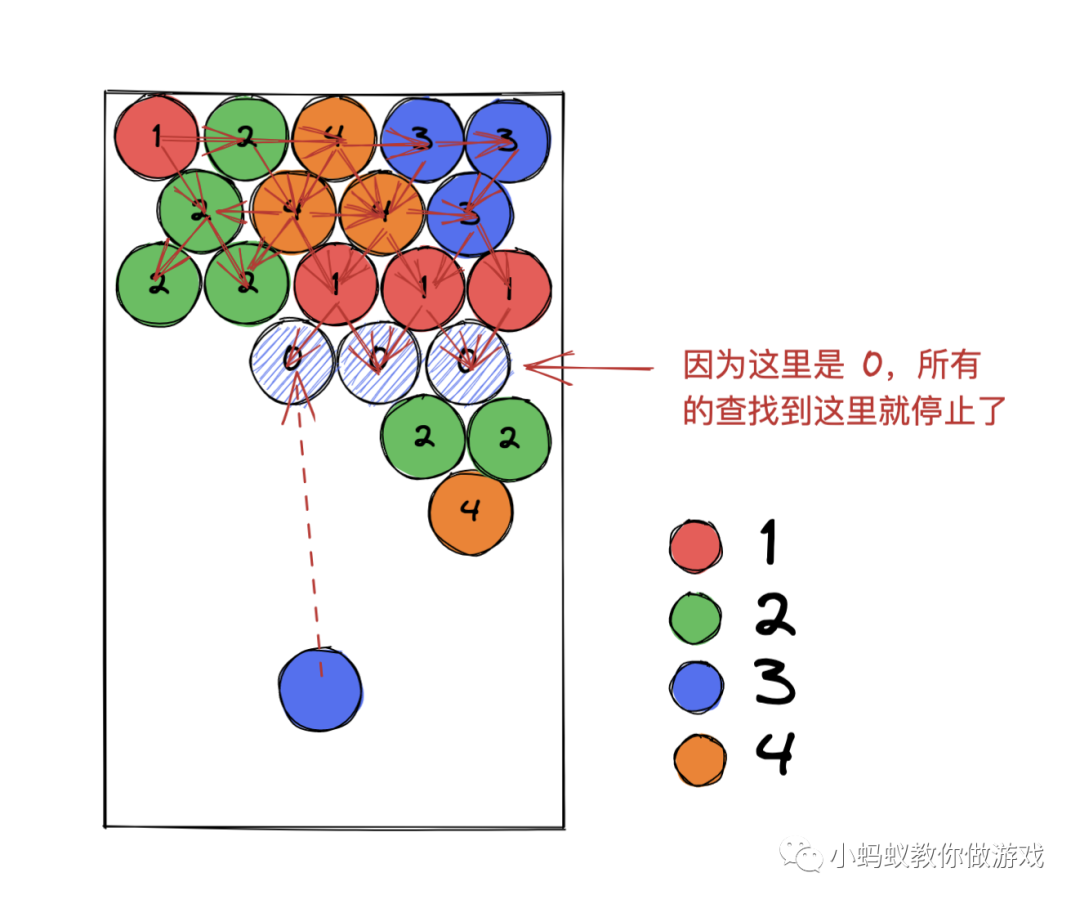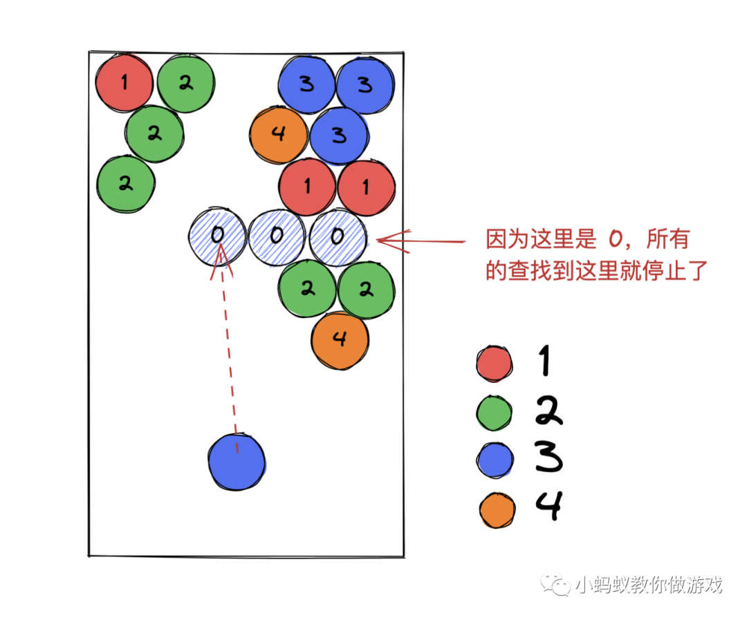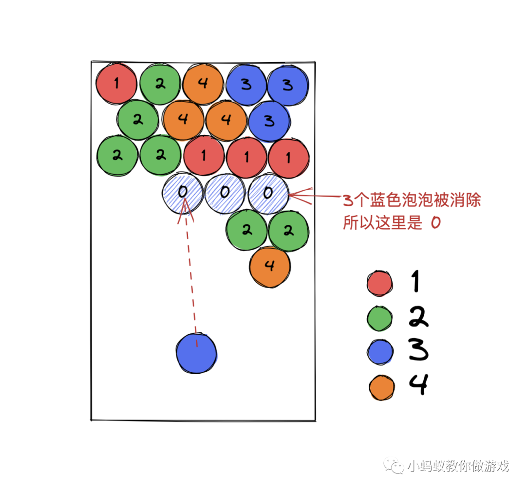 还是先把泡泡进行一下数据抽象,不同的颜色对应的不同的数字,空的位置对应的是 0 。如图,下方 3 个“悬空”泡泡的上方的蓝色泡泡都是 0 ,因为它们满足消除条件,被消除了,所以这里成了空位置(设置为 0)。
