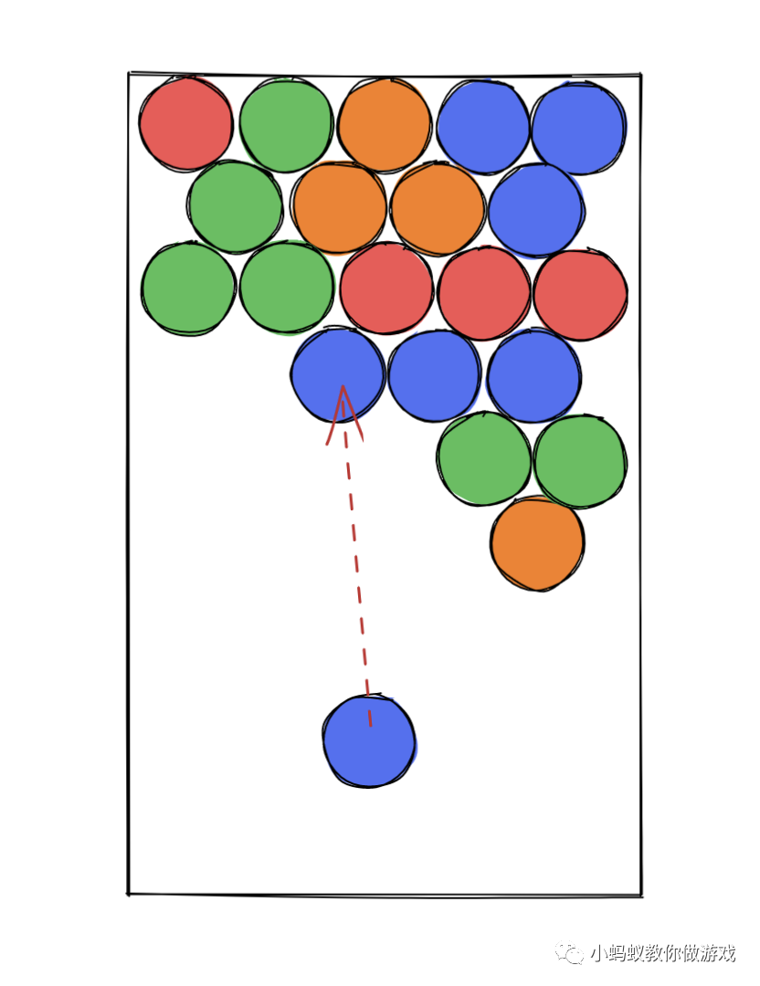 来看一下上方这张图,发射一个蓝色的泡泡,这个蓝色的泡泡停靠后,通过查找算法,找到了它右侧的两个相同的蓝色泡泡,因为数量满足了 3 个,所以这 3 个蓝色泡泡会进行消除。