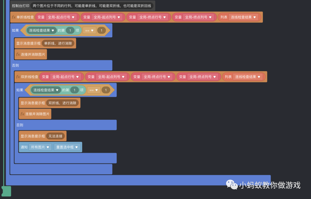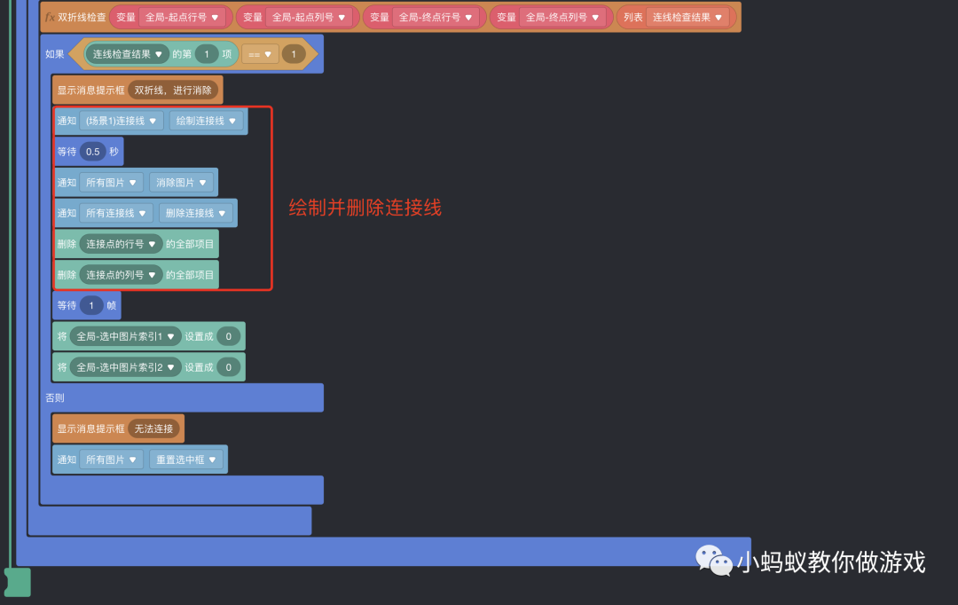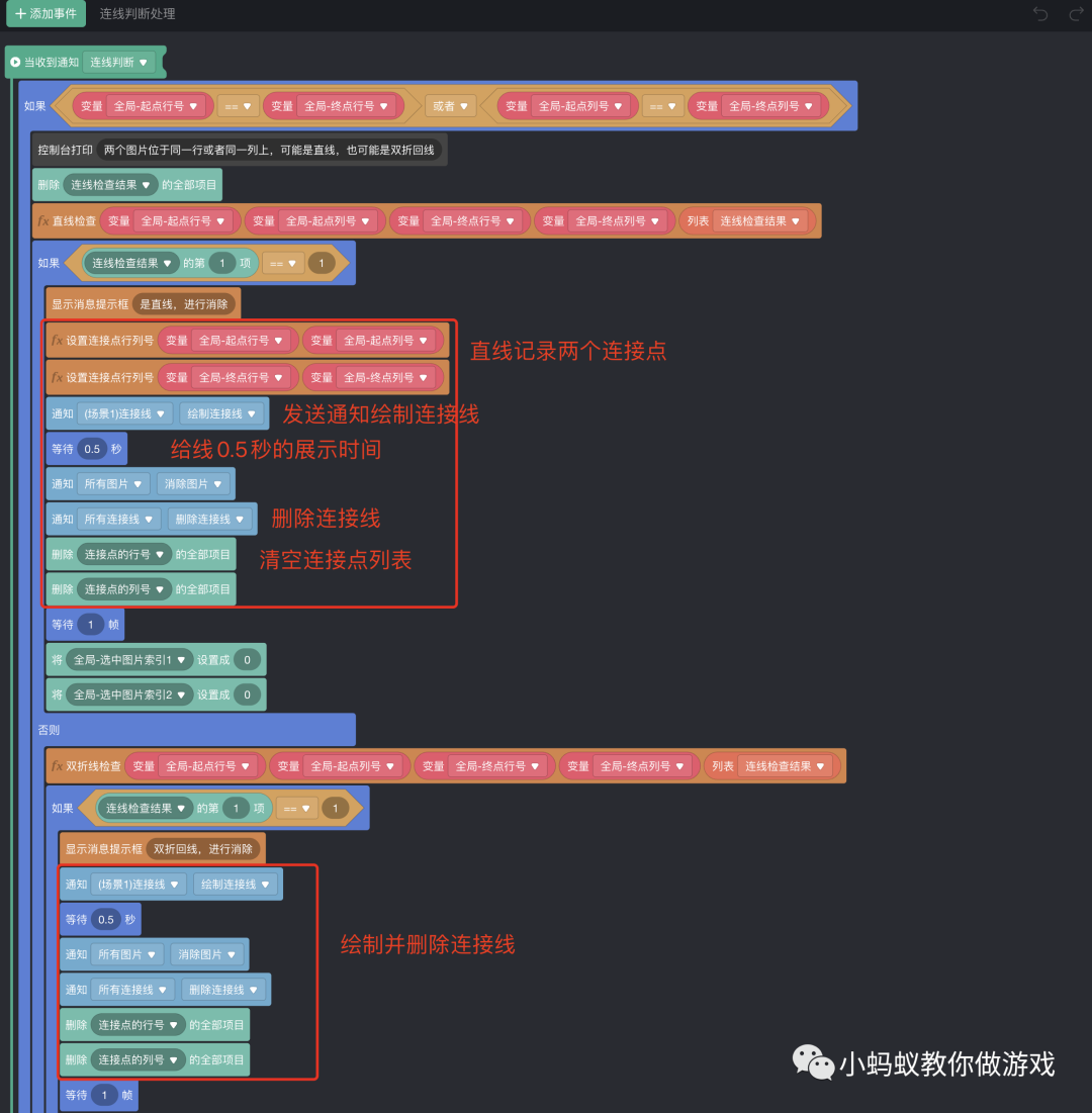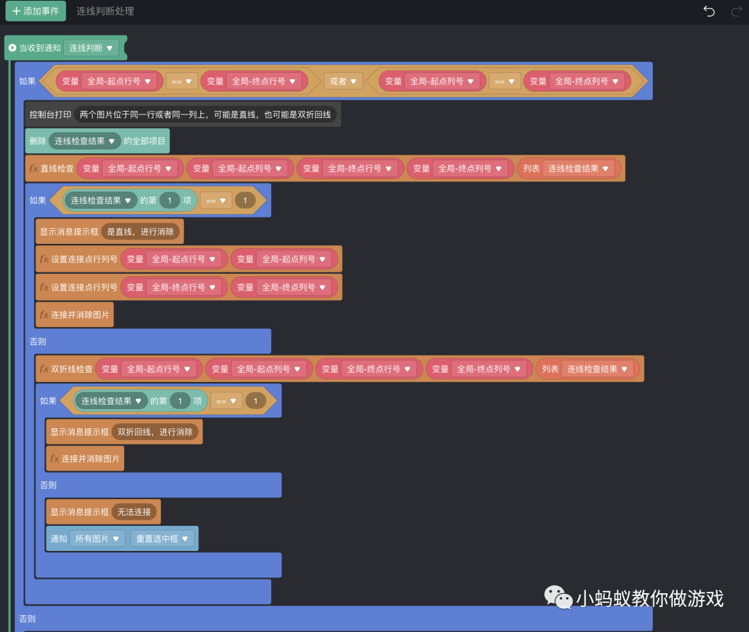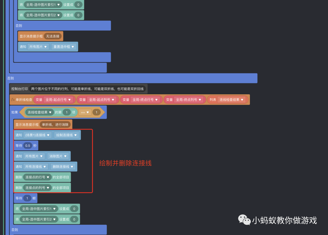 最后,再将“连线判断处理”的积木逻辑做一下优化,因为绘制连接线到消除图片的积木逻辑是一样的,可以复用。