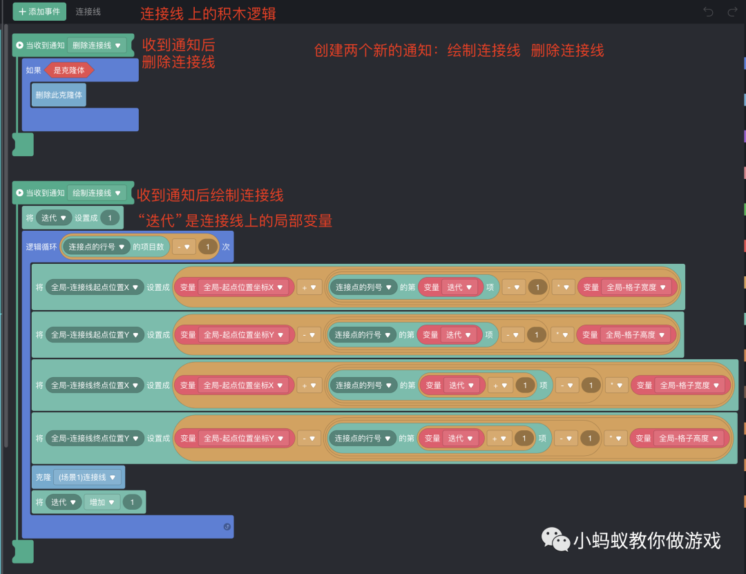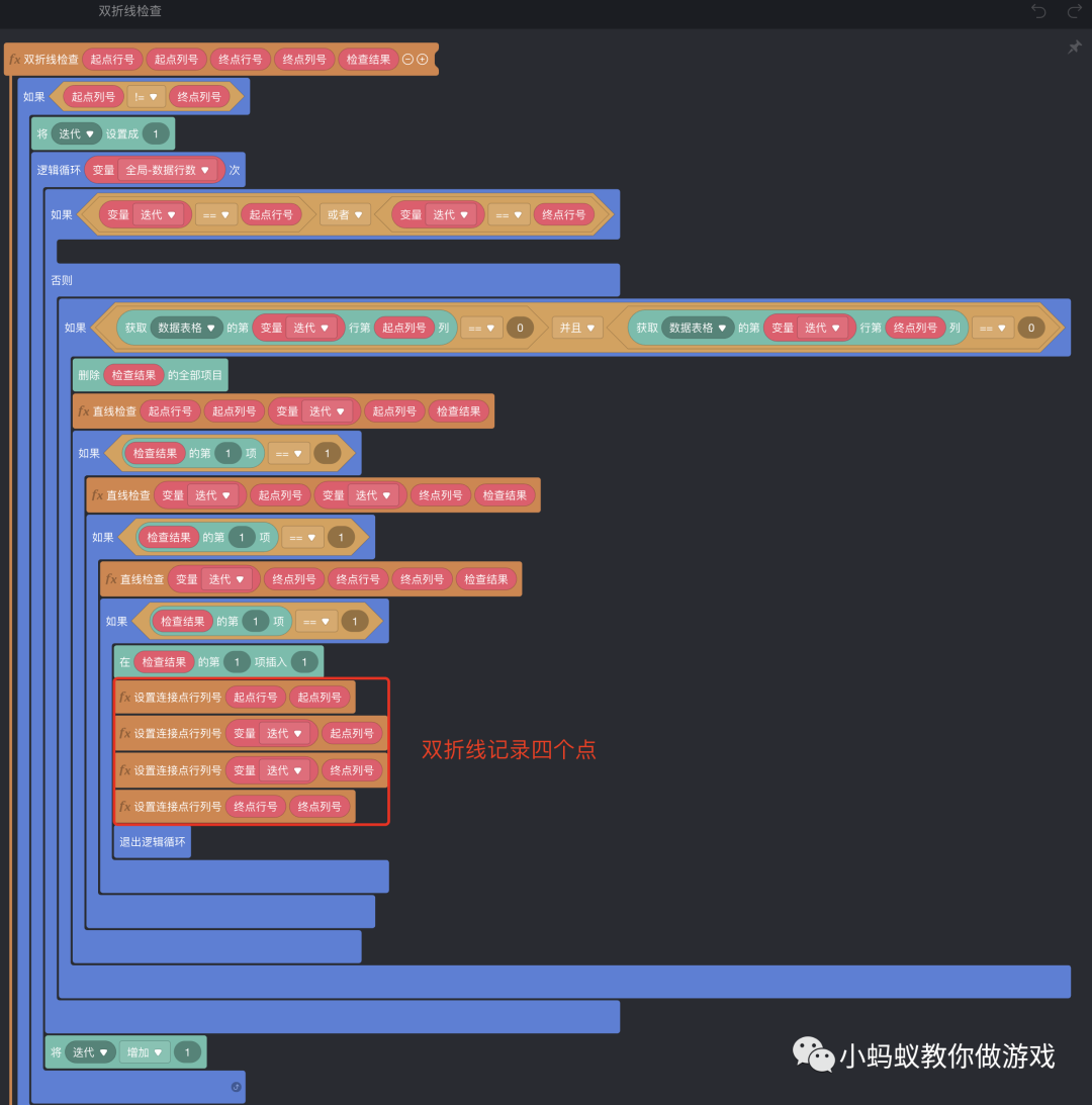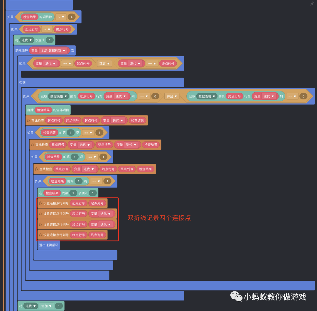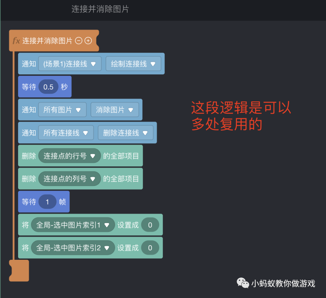 最后,再将“连线判断处理”的积木逻辑做一下优化,因为绘制连接线到消除图片的积木逻辑是一样的,可以复用。