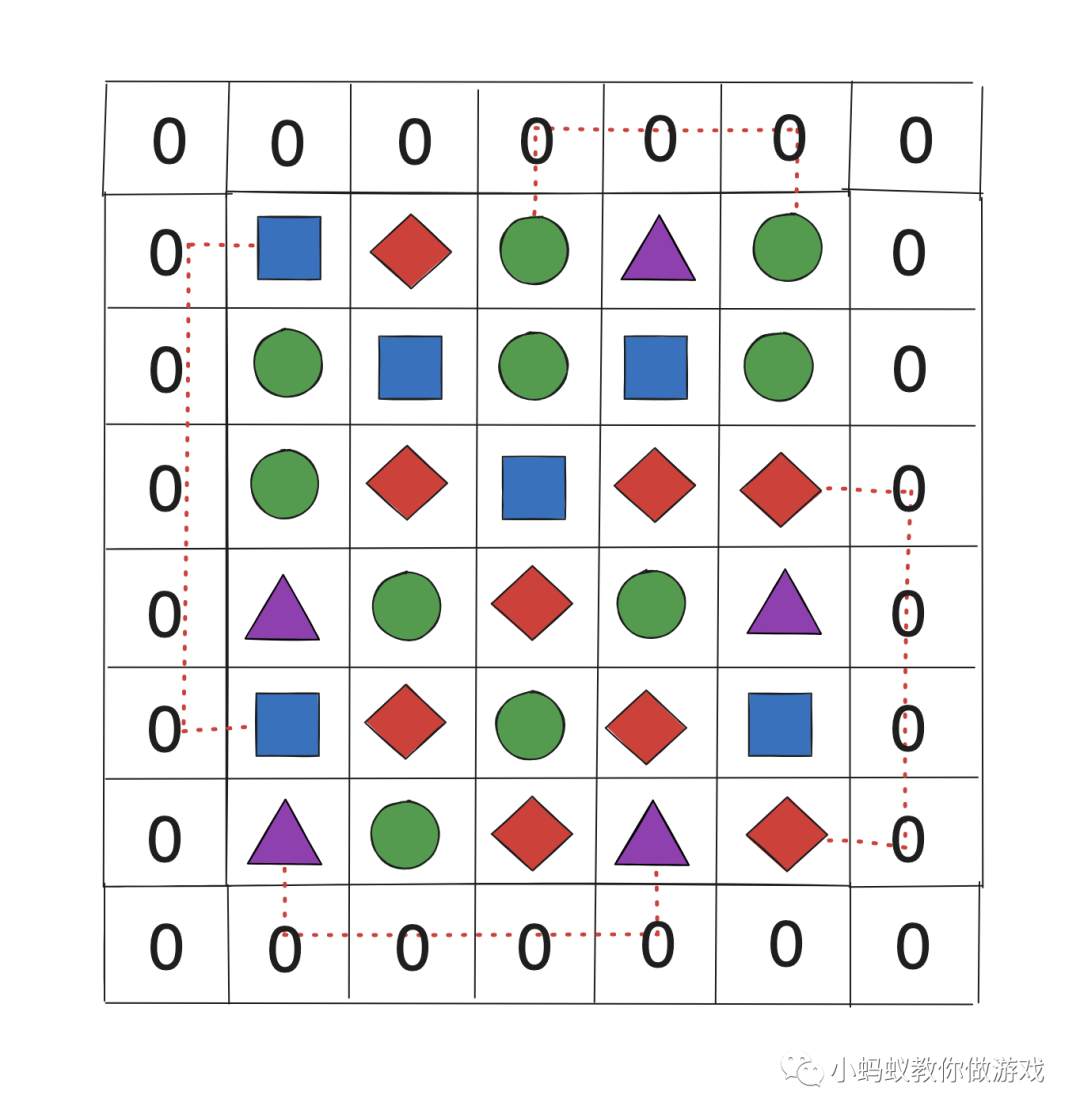 如图,选择两张图片后,如果两张图片满足任意一种连线规则,将两张图片连起来,然后消除。