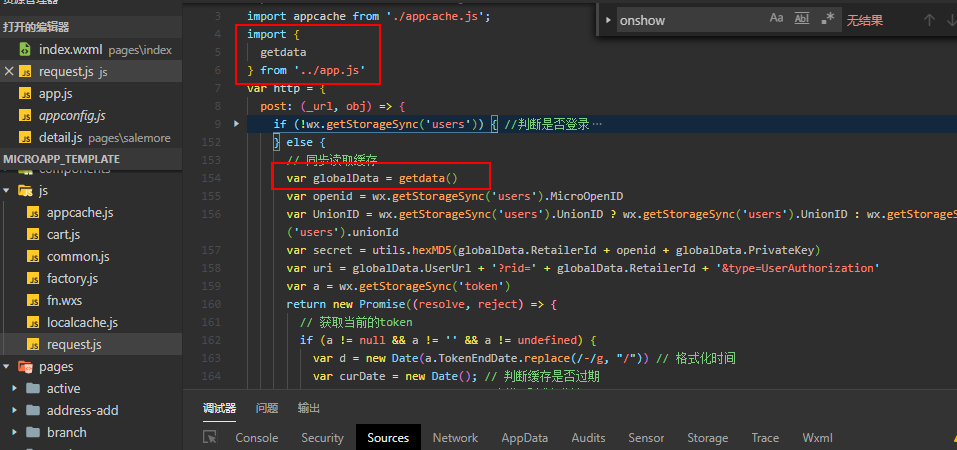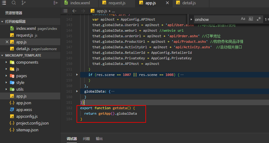 有些时候我们需要在非pages页面中获取到app.js里面的一些配置,比如域名,唯一key等,在我封装的request.js想要获取到globaldata里面的内容通过getApp()是获取不到的,这时候就需要将app.js的数据导出到一个方法,再通过这样的方式就能拿到数据了。这个情况在我写代码的时候遇到过,因为每个零售商的基本信息不同,不能写死,是通过第三方上传代码时配置的,但由于小程序文件加载顺序的问题导致拿不到数据。