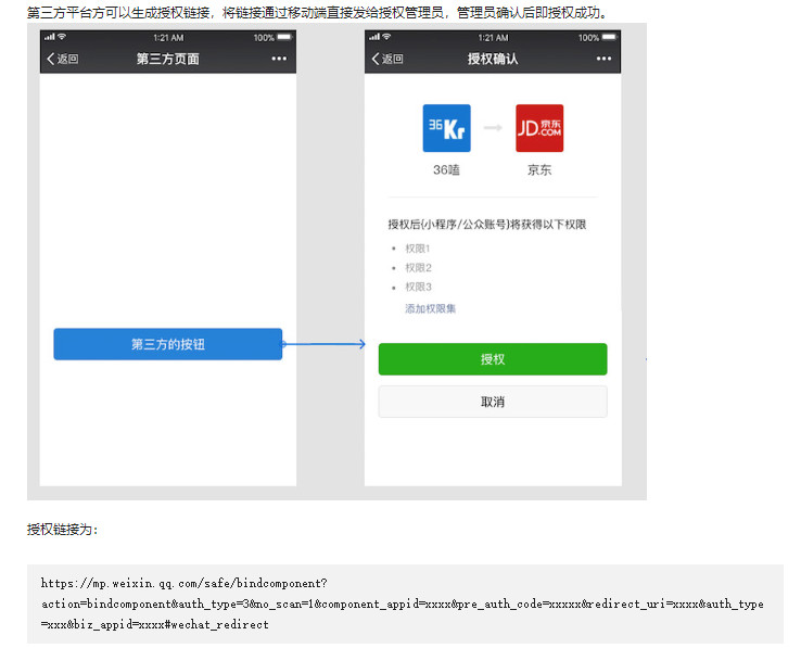 ②点击移动端链接快速授权https://mp.weixin.qq.com/safe/bindcomponent?action=bindcomponent&auth_type=3&no_scan=1&component_appid=xxxx&pre_auth_code=xxxxx&redirect_uri=xxxx&auth_type=xxx&biz_appid=xxxx#wechat_redirect