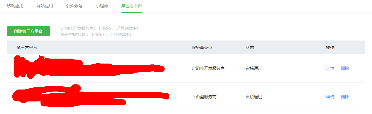 然后提交审核就可以了,如果信息没有问题是马上就能审核成功的,然后再管理中心的第三方平台即可看到改第三方服务商,详情里面即有改第三方平台相关的配置信息