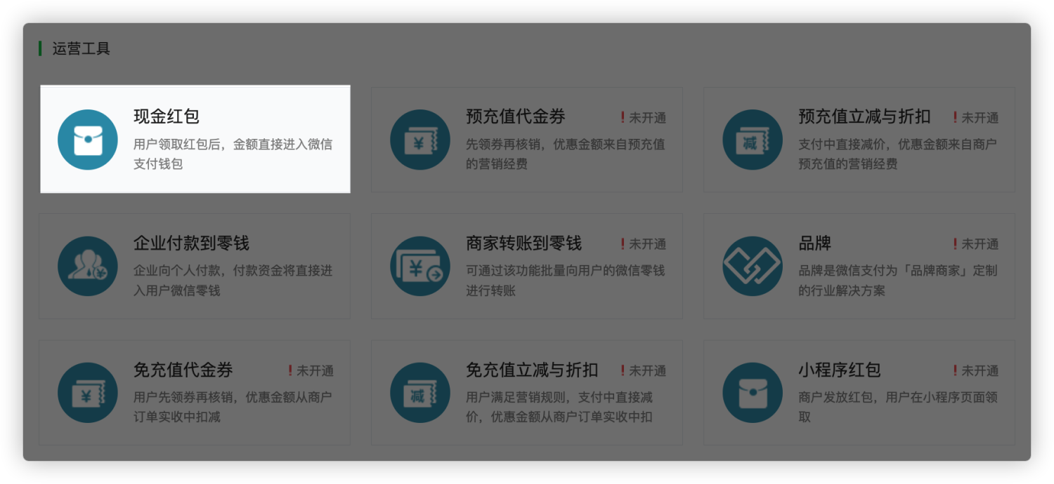 - 服务号/订阅号的商户号已获得“现金红包”接口权限;