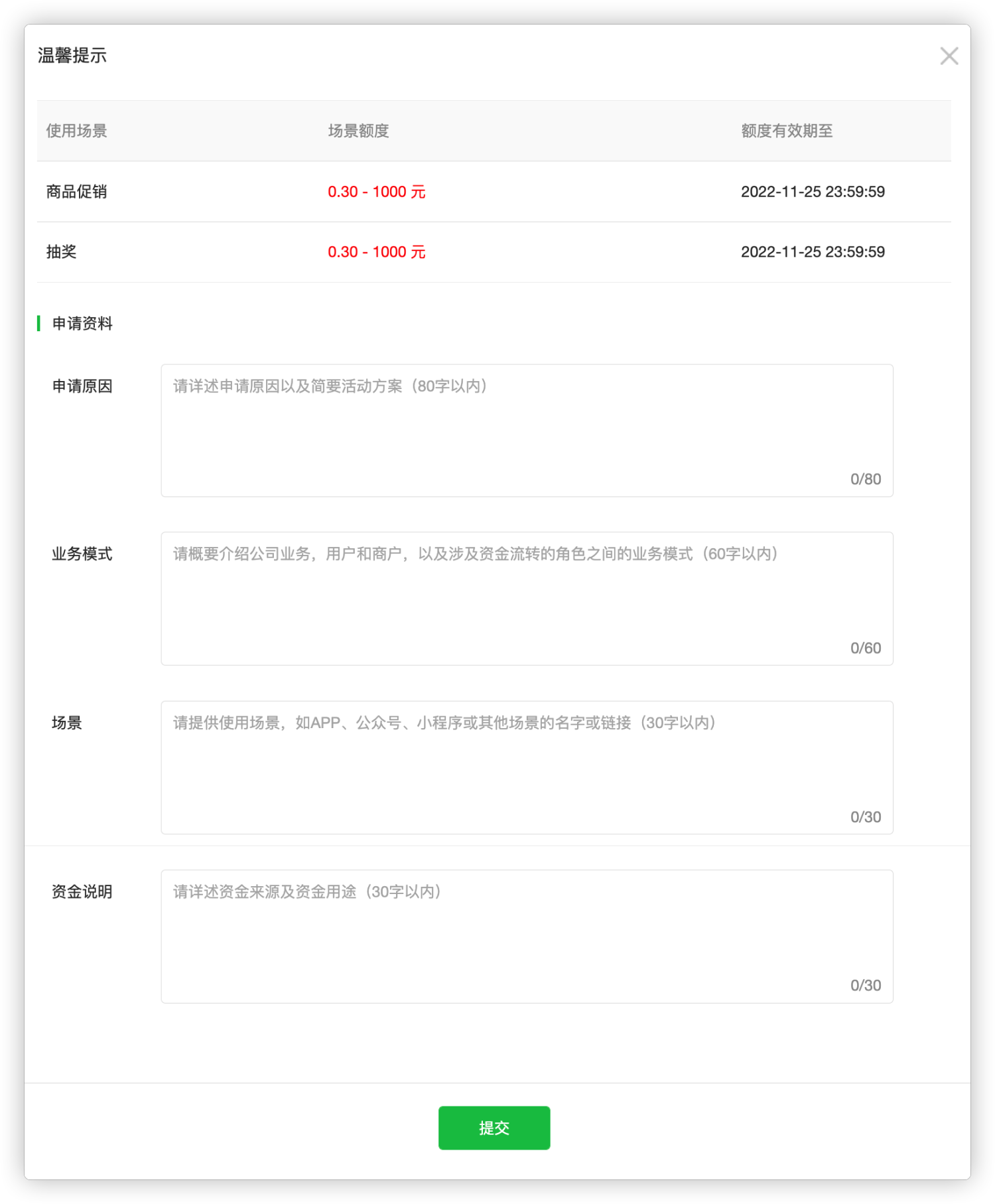 三、场景额度在默认限额(1元~200元)内调整不用审核,若需超出默认限额,可在“使用场景”中修改场景额提交申请,由微信支付团队审核通过后即可配置使用;
