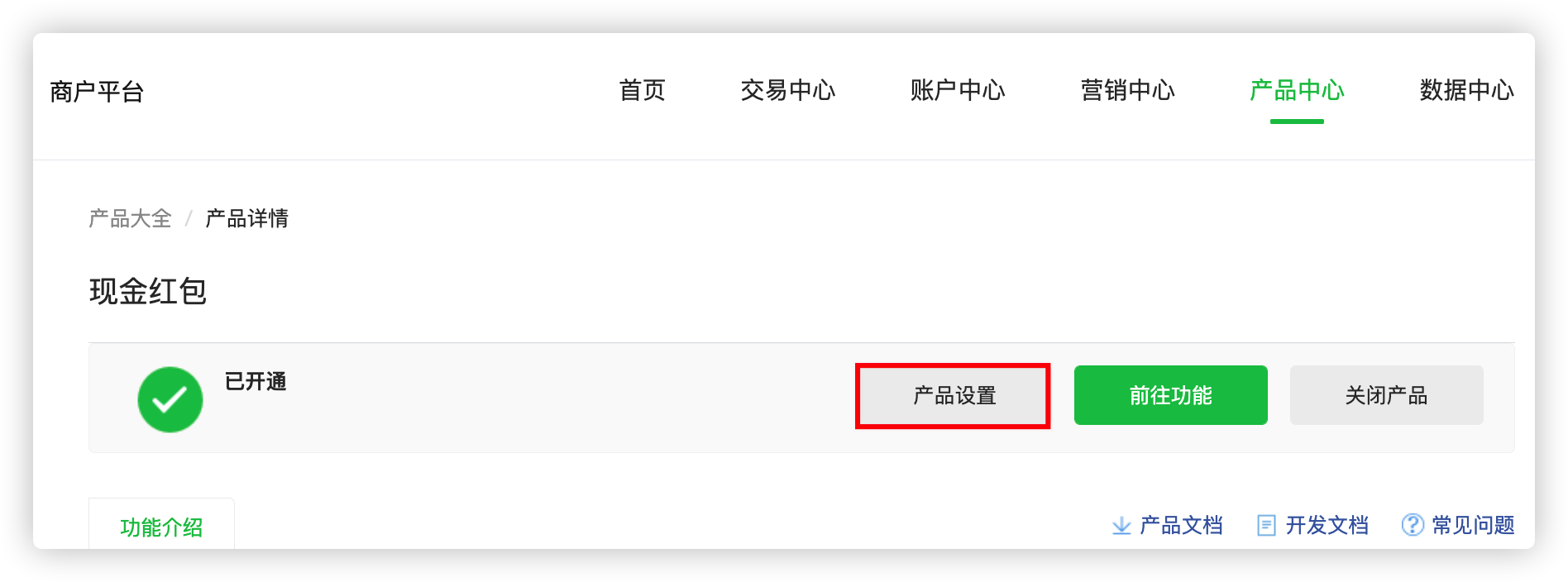 一、登录微信支付商户平台 -> 产品中心 -> 产品大全 -> 运营工具 -> 现金红包 -> 产品设置;