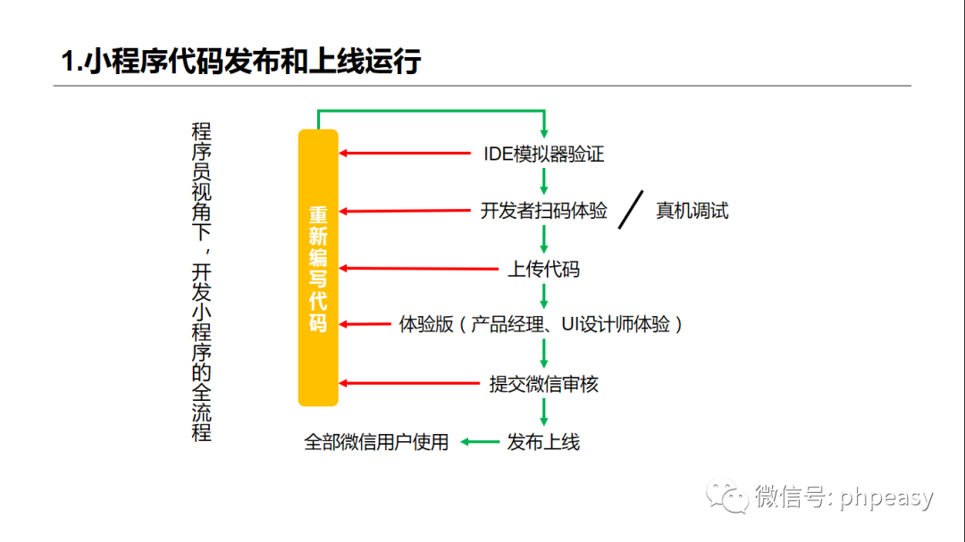 代码上传后,一般我们会设置为体验版并邀请产品经理以及UI设计师查看体验,没有问题后就可以提交审核,一般在几小时到几天之内就能看到审核结果,如果小程序没有违反相关规定就会被通过,此时开发者登录小程序平台将代码进行发布,发布后该版本的代码全部微信用户都能够使用了。只有上一步没有问题以后,我们才能开始下一步。如果上述步骤任何一步出现问题,都需要重更新修改改代码,然后重新开始整个流程。