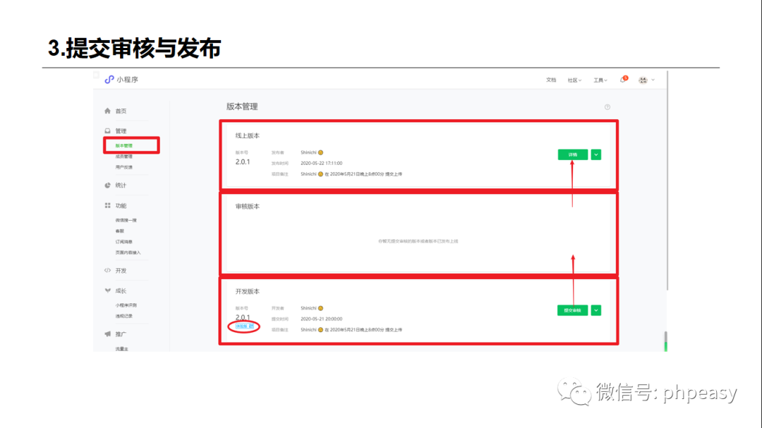 接下来我们登录小程序的网页管理后台,可以发现我们刚才上传的代码已经出现在开发版本这里,也就是最后一栏。这里我们可以点击体验版的二维码进行体验,如果没有这个蓝色的标志,需要在右边的下拉箭头中选择选为体验版,这里的开发版本每个上传代码的开发者只能有最新的一个显示在这里,多次上传会覆盖之前的版本,如果两位开发者都上传了代码,那么体验版只能选取一个。当我们点击提交审核并且按照弹框操作后,代码就会出现在审核版本,也就是中间这部分,此时我们需要等待微信审核。审核通过后一般微信会收到提醒,我们可以在审核版本这里点击发布,则该版本就会变为线上版本,出现在第一行,此时代码的发布就完成了。