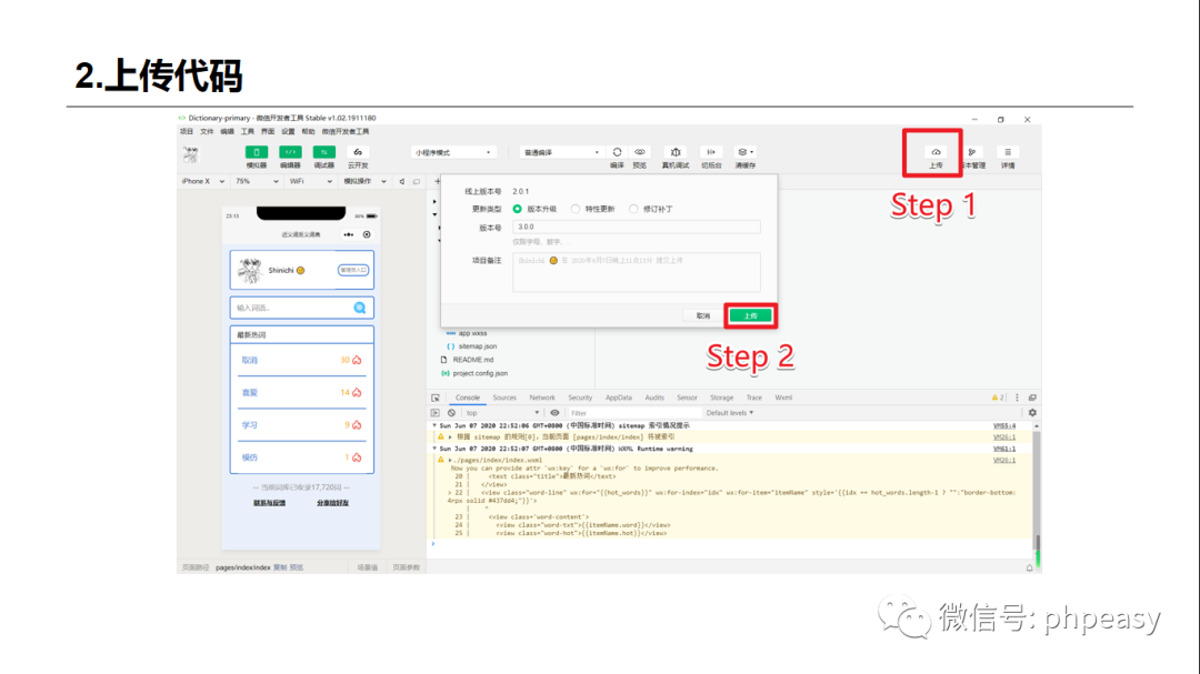 那么,如何上传代码呢?我们使用开发工具,点击右上角的上传按钮,在弹框中输入版本号和备注,这两个主要是开发人员用于版本控制和版本说明的,由我们自己定义就可以了。然后我们点击绿色的上传按钮就完成代码上传了。