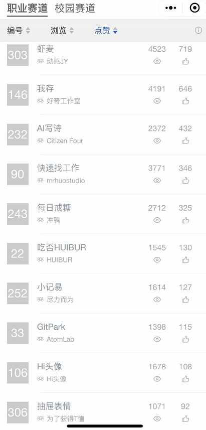| 参赛队伍 | 虾麦 | 我存 | AI写诗 | 快速找工作 | 每日戒糖 | 吃否HUIBUR | 小记易 | GitPark | Hi头像 | 抽屉表情 |