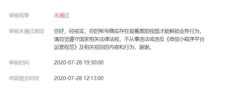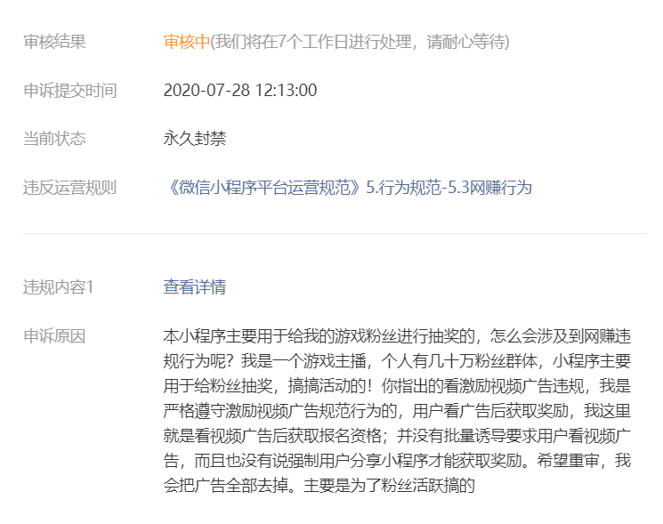 但是我不能理解的是,小程序官方的审核人员、以及广告的审核是怎么让我的审核通过的,让我的小程序处于封禁的处境,说审核通过的是你们,说违规的还是你们,当然可能你们是两拨人,要不这不是啪啪打自己脸嘛