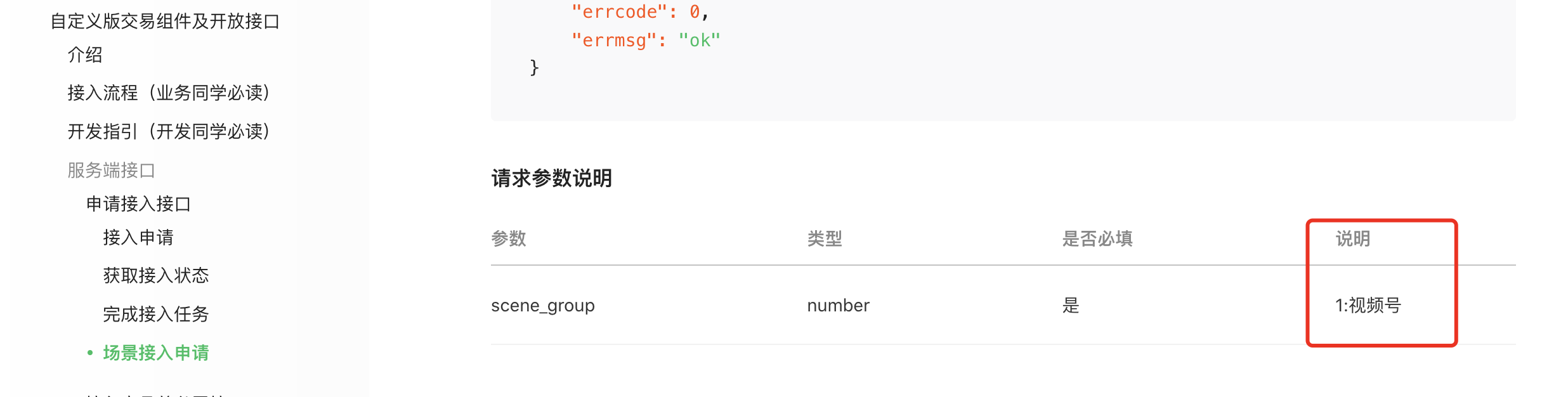 https://api.weixin.qq.com/shop/register/apply_scene?access_token=xxxxxxxxx 示例中并未提供交易组件场景,只有视频号场景,所以不理解是什么意思?请确认交易组件场景是否开通 rid: 6391b010-265c5604-21022ec2。