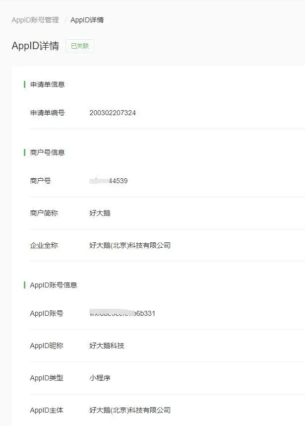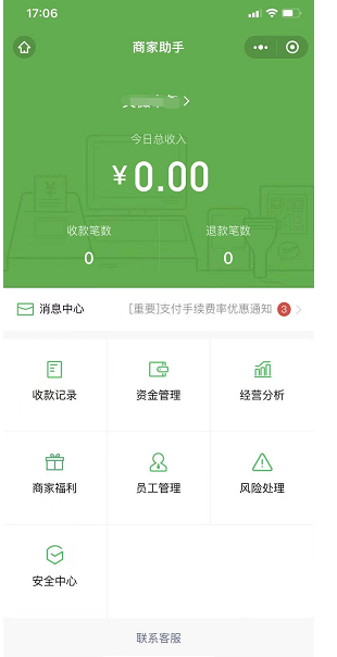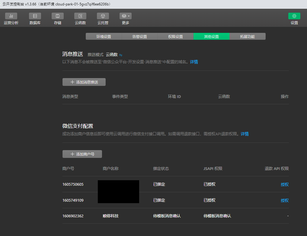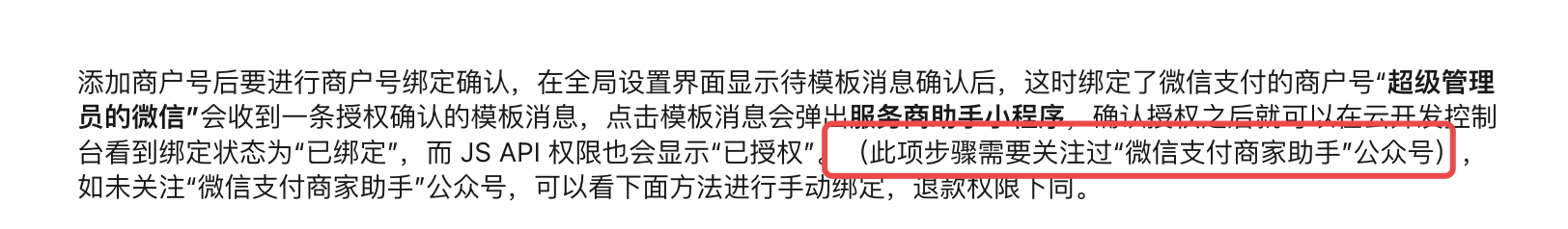 添加商户号后要进行商户号绑定确认,在全局设置界面显示待模板消息确认后,这时绑定了微信支付的商户号“超级管理员的微信”会收到一条授权确认的模板消息,点击模板消息会弹出服务商助手小程序,确认授权之后就可以在云开发控制台看到绑定状态为“已绑定”,而 JS API 权限也会显示“已授权”。(此项步骤需要关注过“微信支付商家助手”公众号),如未关注“微信支付商家助手”公众号,可以看下面方法进行手动绑定,退款权限下同。