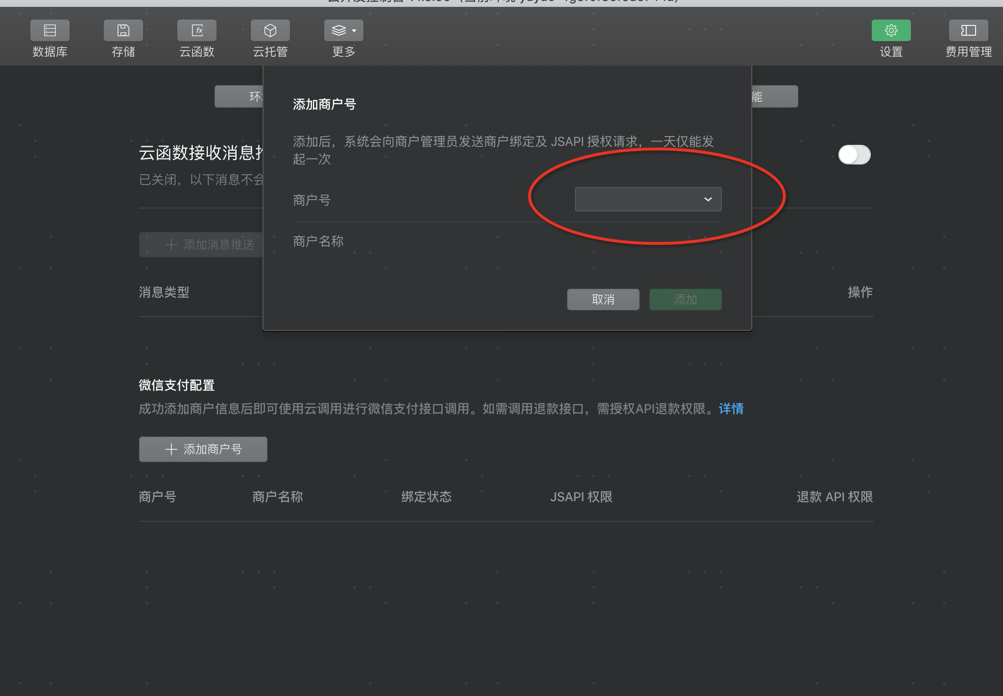 云开发微信支付配置商户号方式:在云控制台 -> 设置 -> 全局设置->添加商户号->输入要绑定的商户号