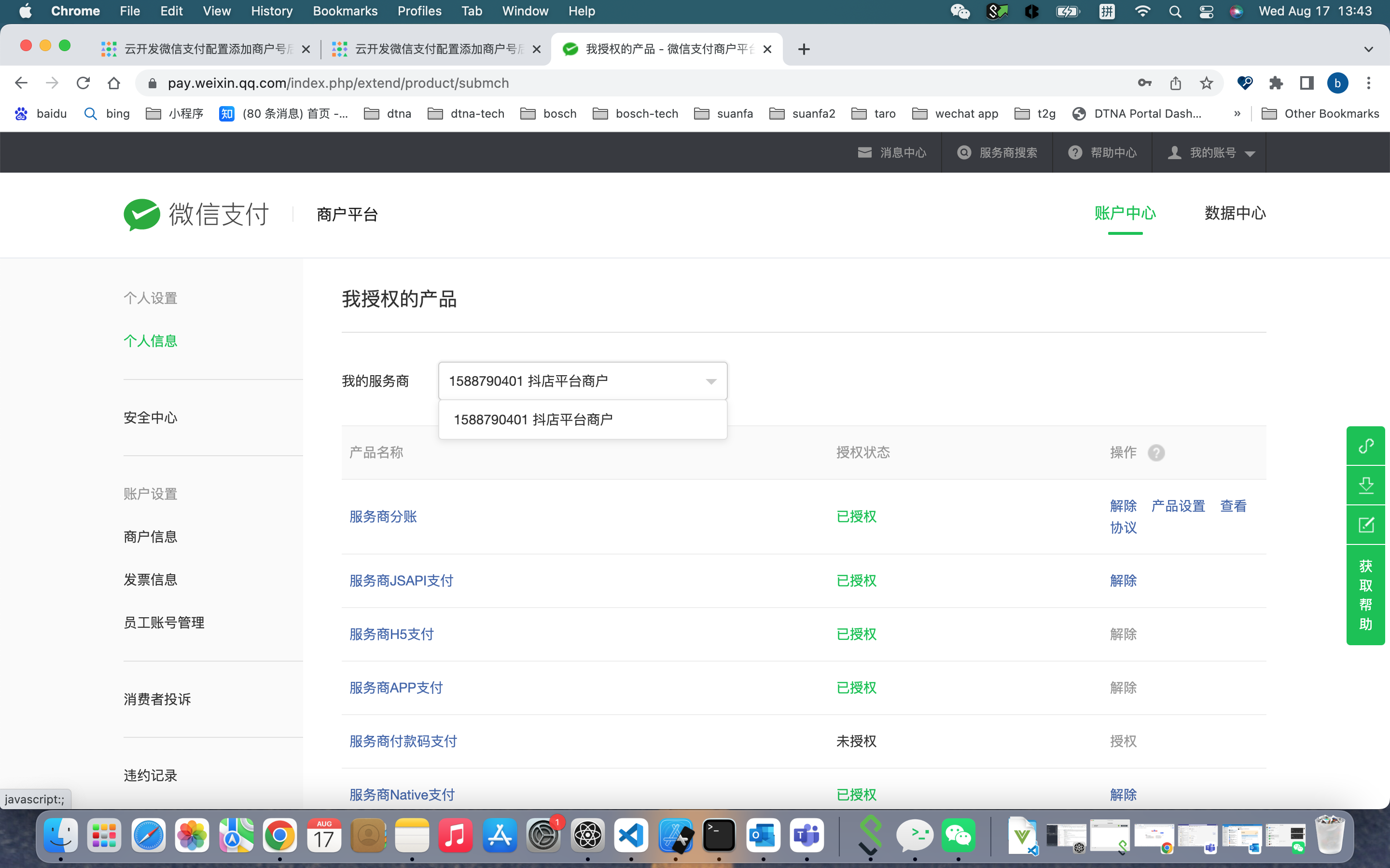 在云开发控制平台中绑定商户号并点击授权后,“超级管理员”的微信未收到模版确认消息。(该微信账号已关注‘微信支付商家助手'公众号)。 在商户平台-产品中心中并无 ‘我的授权产品’栏目,点击文中 ‘授权产品’连接后显示 "errorcode": -3, "msg": "获取特约商户的服务商失败",不清楚接下来该怎么做?