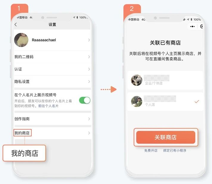 要通过视频号这一巨大公域流量入口进行引流,首先需要打通视频号与小商店。目前小商店支持与超级管理员、成员或者导购分销员的视频号进行关联。商家进入视频号的设置界面后,点击【我的商店】进入小商店/小程序绑定界面,选择需要绑定的商店,点击【关联商店】即可完成绑定,这也就实现了视频号与小商店的打通。