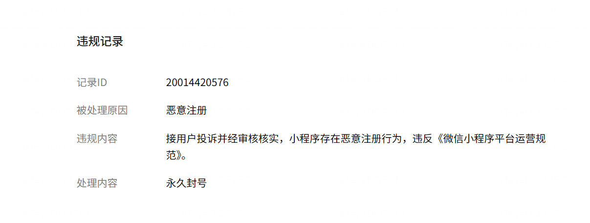 接用户投诉并经审核核实,小程序存在恶意注册行为,违反《微信小程序平台运营规范》。