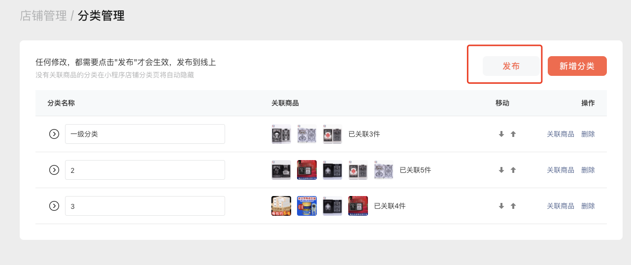 创建完毕后,需要点击【发布】,分类才会生效;到这步之后,你的小商店底部栏目,将会多一个“分类”标签。