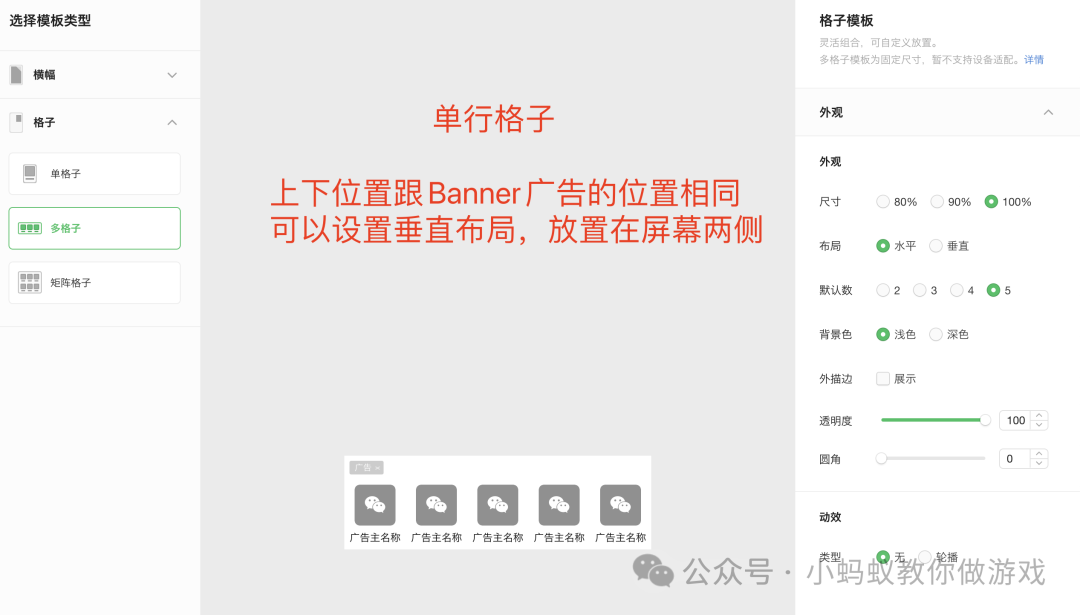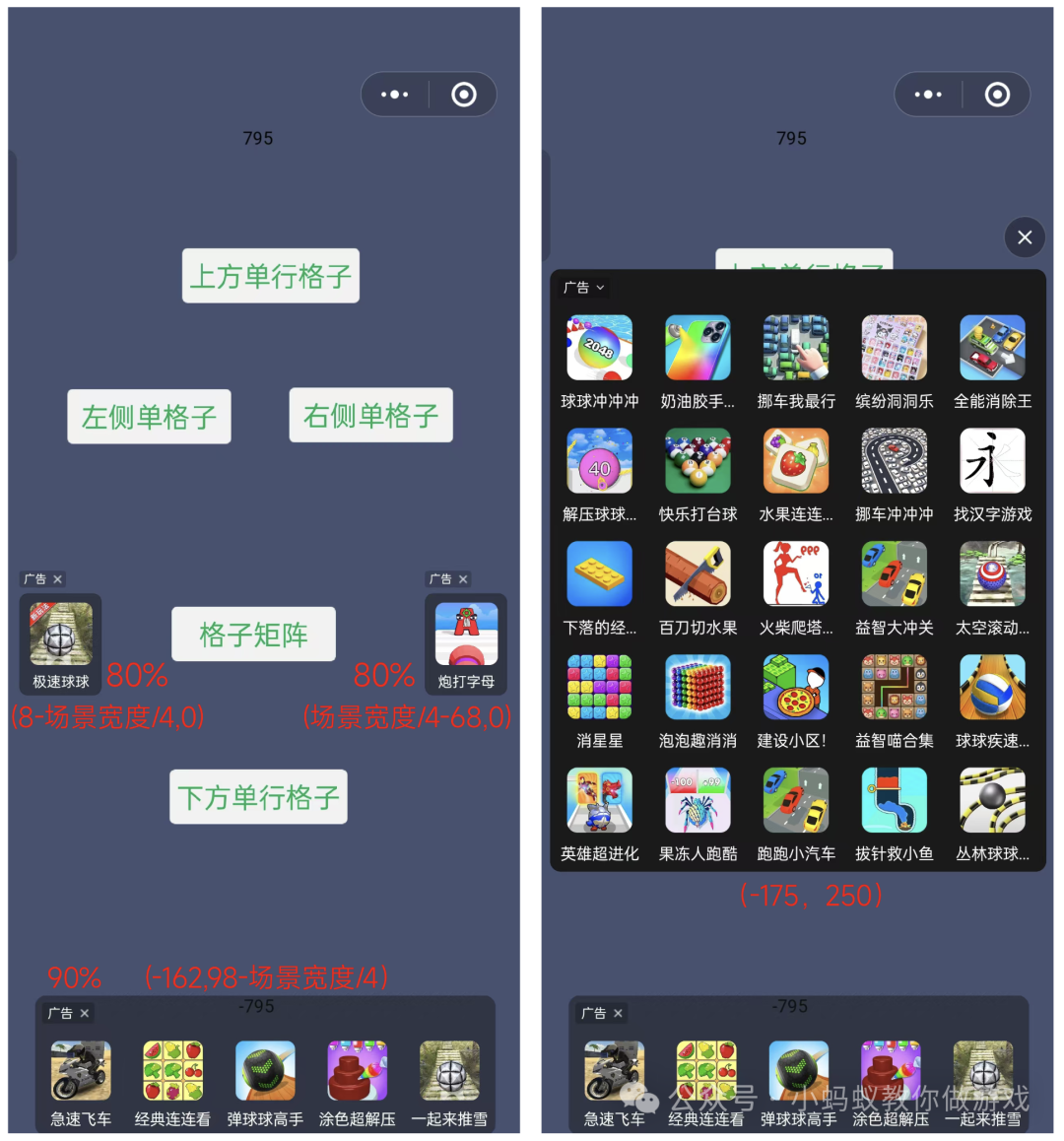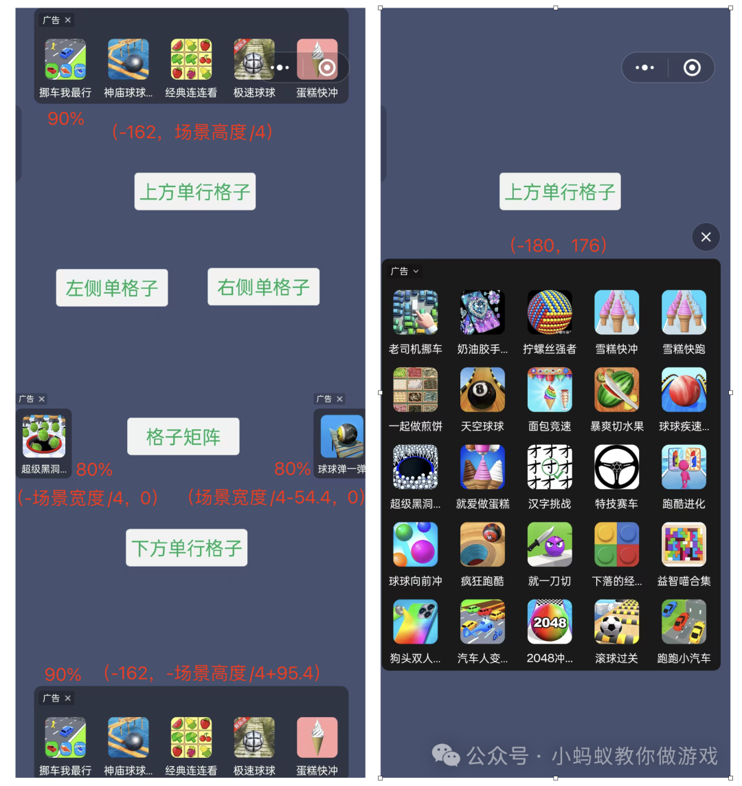 下方是我使用的广告位置数值,仅供参考,单格子广告与屏幕两侧留出一点距离,下方的单行格子稍微往上提升一点,避免遮挡到下方的文字,矩阵格子显示在屏幕的中央。