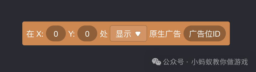 该积木一共有三个参数,前两个参数用于设置广告在屏幕上的显示位置,最后一个参数用于填广告位ID。