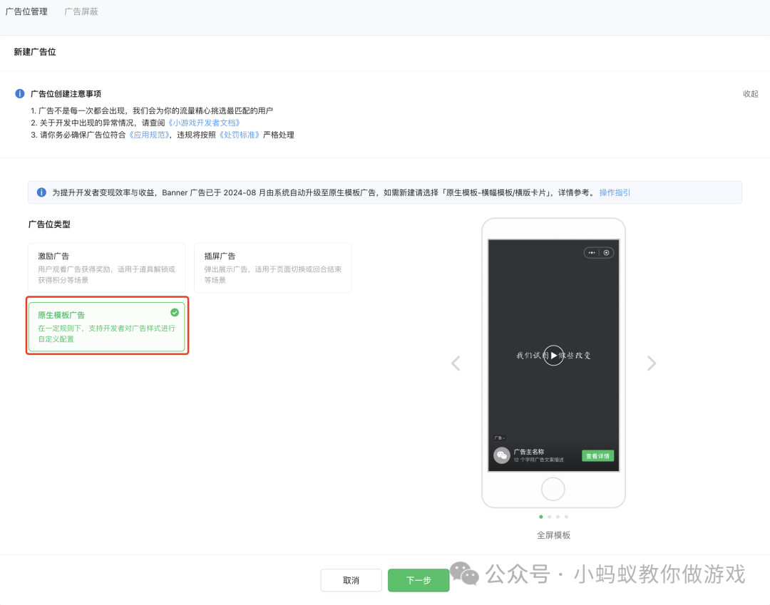 创建广告位时选择【原生模版广告】。