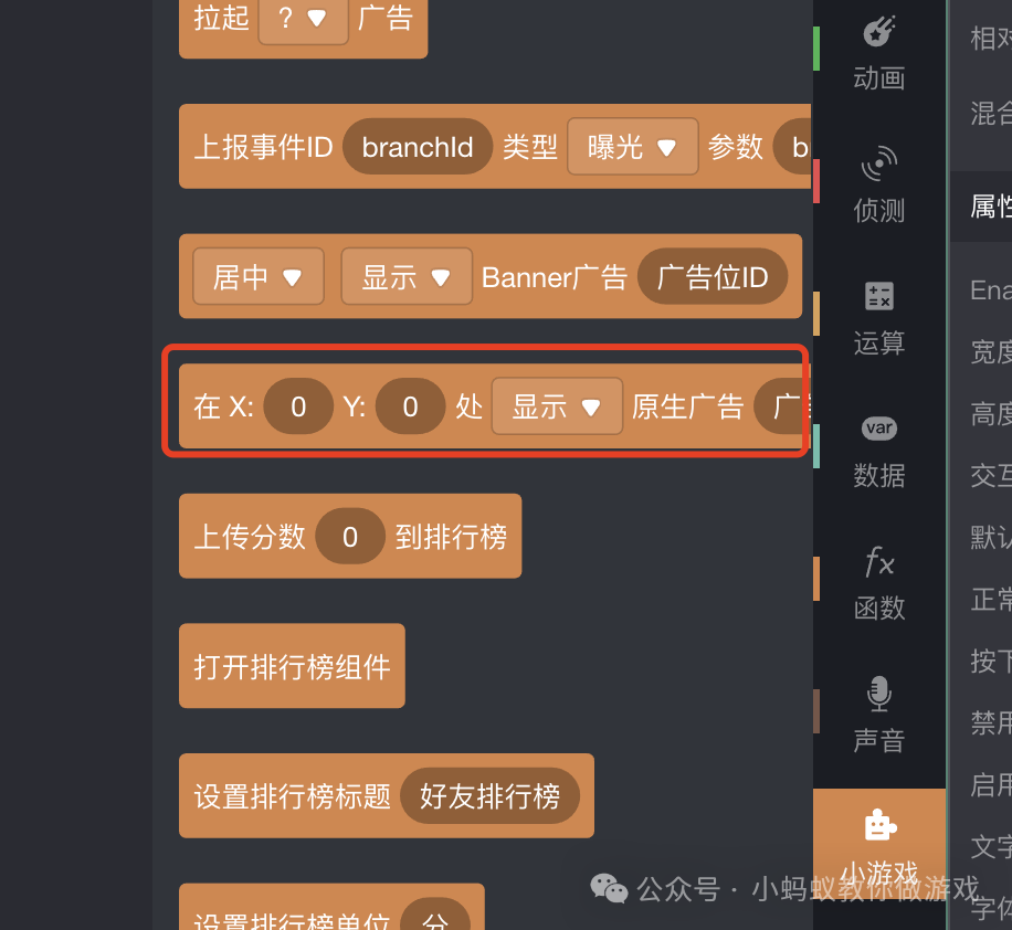 在微信小游戏制作工具中,接入原生广告需要用到【小游戏】类别中的原生广告这块积木。