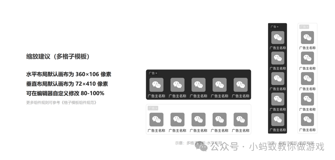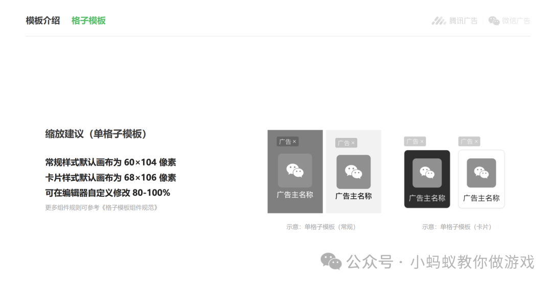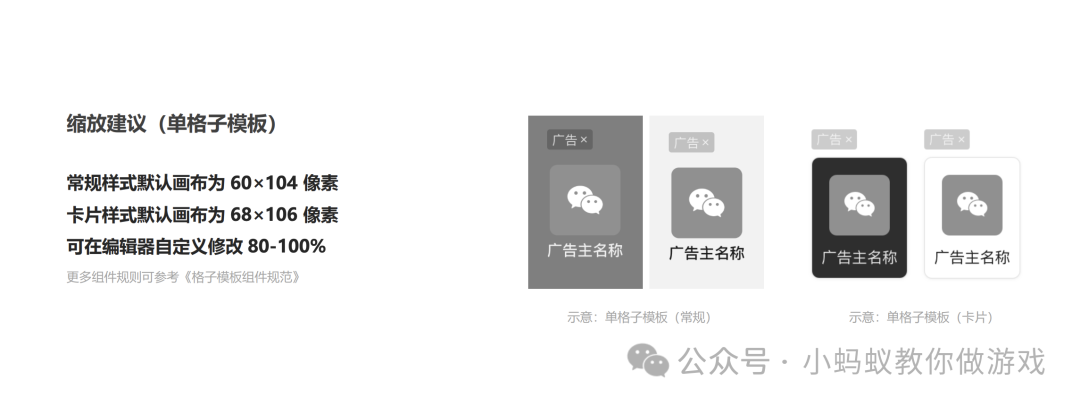 如何查看和计算对应广告的尺寸?举个简单的例子,如上图是文档中的单格子模版,单格子模版有两种样式,常规样式和卡片样式,两种样式的广告尺寸不同。除了样式之外,我们在后台创建广告时,还可以在属性中设置广告尺寸的大小,一共有三个选项,分别为 80%,90%,100%。假设我们创建了卡片样式的单格子广告,并将其尺寸设置为 80%。那最终这个广告的尺寸为卡片样式的广告尺寸 68 x 106,然后乘以 80%,最终的尺寸为 54.4x84.8。