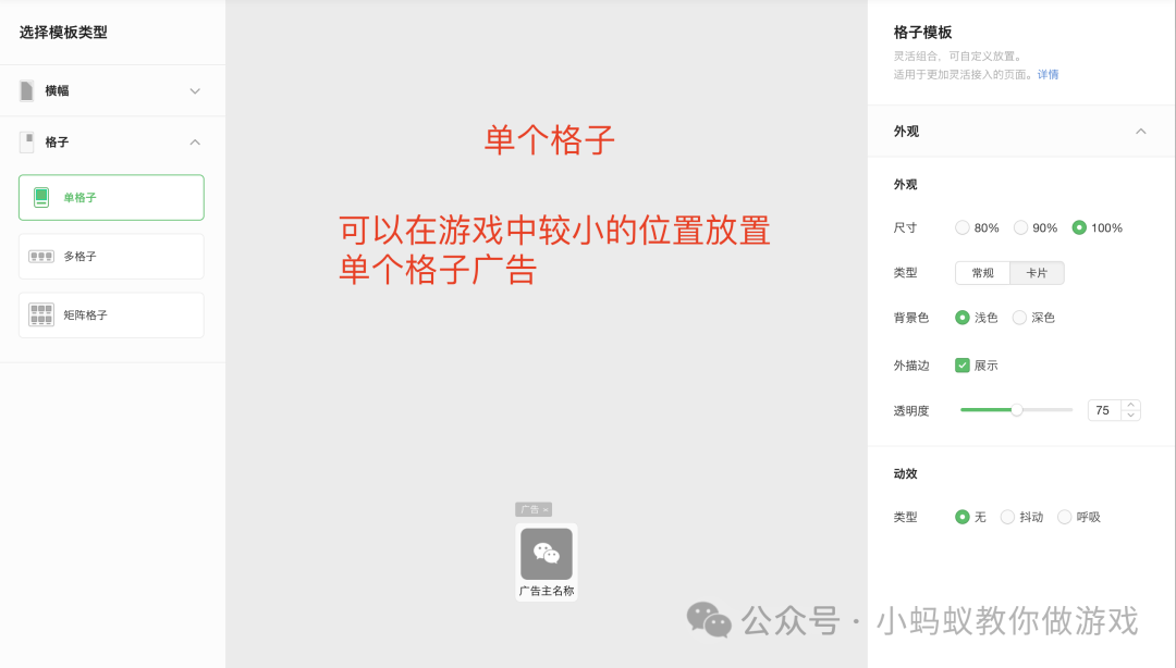 1.右侧的单格子广告,单格子广告为卡片样式,尺寸设置为 80%。